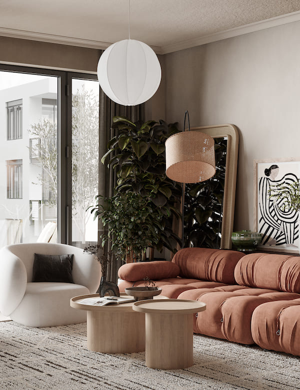 Одним из ярких трендов дизайна являются округлые формы мебели, они добавляют мягкость, гармонию и органичность в интерьер, создавая более уютную и приглашающую атмосферу. Могут быть использованы в различных элементах мебели, таких как диваны, стулья, журнальные столики.