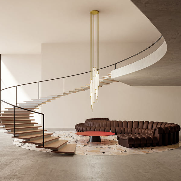Лестничные пролёты в загородных домах и городских двух- и многоуровневых квартирах часто украшаются каскадными светильниками. Красивая многоярусная люстра отлично справляется с освещением высоких лестниц, при этом занимает собой пустующее пространство, избавляя от ощущения пустоты и незавершённости.