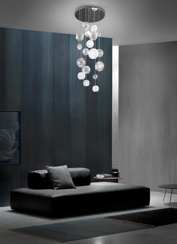Каскадные светильники бывают накладными и подвесными. Первые монтируются прямо на потолок, за счёт чего выглядят более компактно. Некоторые из таких моделей можно рассматривать даже для комнат небольшого метража со стандартной высотой потолков.