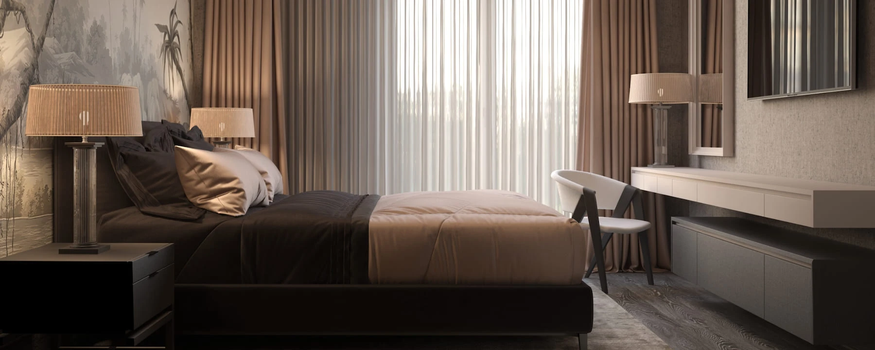 Глянцевые поверхности мебели, стеклянные столешницы, металлические элементы декора отражают свет и создают игру бликов, добавляя пространству динамики.