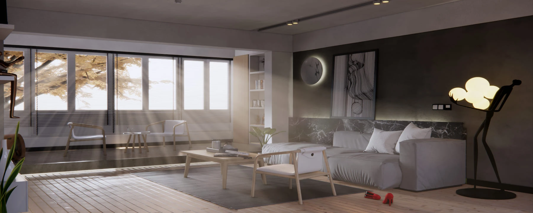 В минималистичном интерьере освещение часто используется не только функционально, но и как способ зонирования пространства.