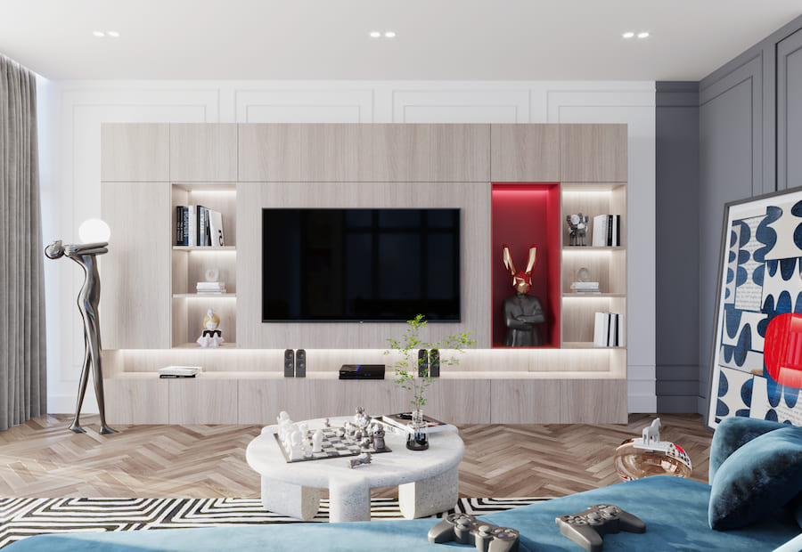 Встроенные светильники — отличная альтернатива для очень низких потолков. Они практически не занимают вертикального пространства, создавая при этом равномерное освещение. Расположите их по периметру комнаты или создайте интересный геометрический узор на потолке. Такое решение не только функционально, но и может стать интересным декоративным элементом.