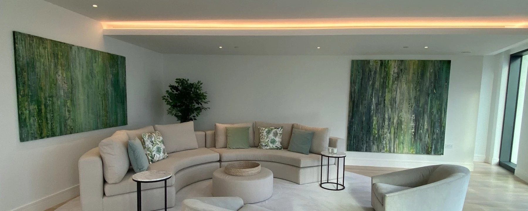 Не ограничивайте себя одним типом освещения. В современном дизайне часто используют многоуровневый свет с разной цветовой температурой. Например, в гостиной основной тёплый свет можно дополнить нейтральной подсветкой для чтения или холодной акцентной подсветкой декоративных элементов.
