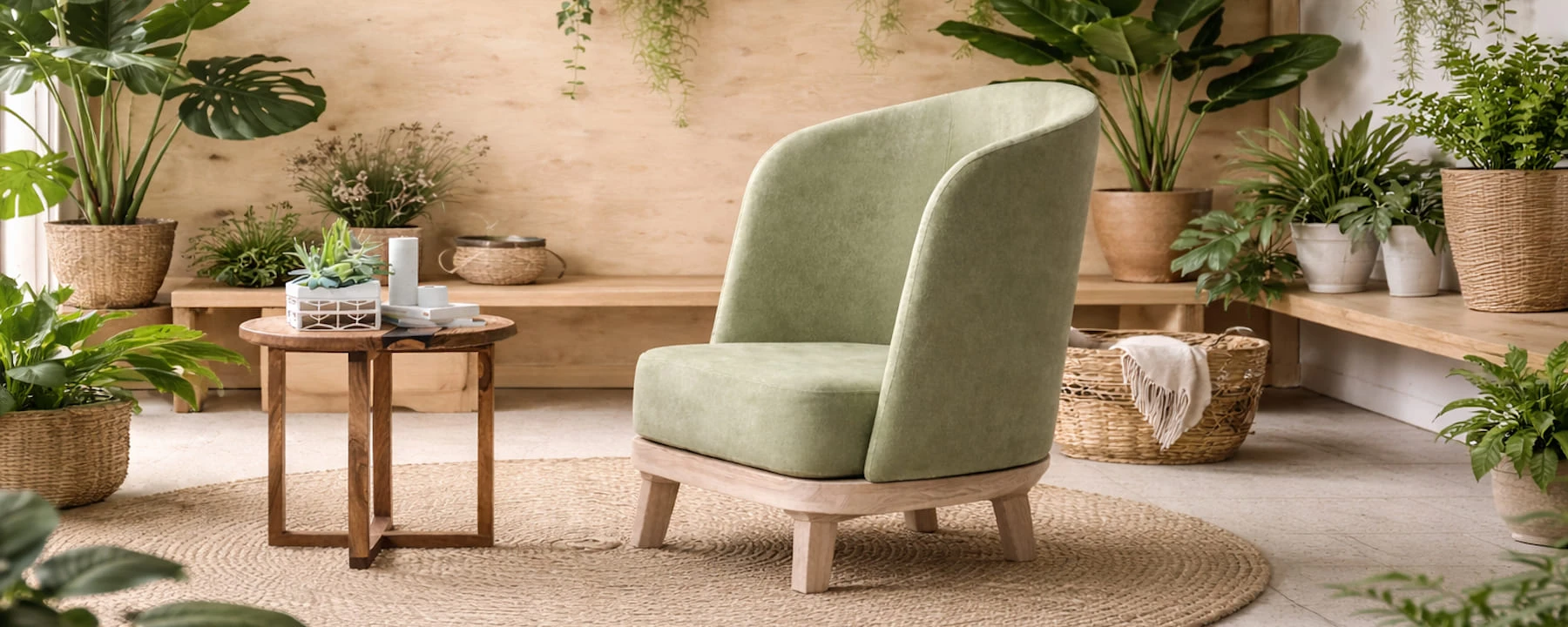 Деревянные элементы - ножки, подлокотники, каркасы - подчёркивают природную эстетику кресла. Актуальны светлые породы (дуб, ясень, берёза) с минимальной обработкой, где видна естественная текстура.