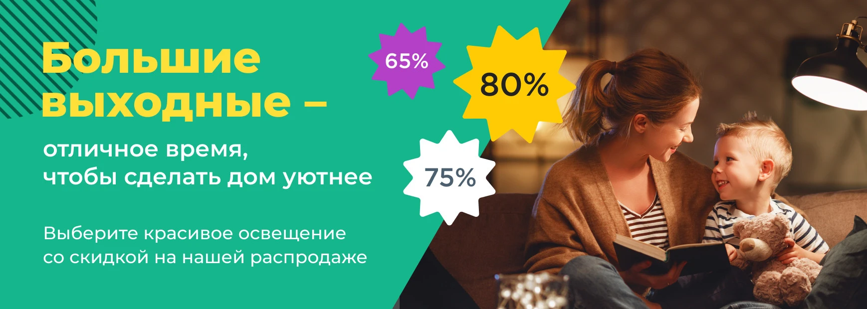 В честь больших выходных предлагаем вам онлайн-шоппинг освещения с супер скидками до 80% на самые популярные модели. Только у нас выгодные акции, быстрая доставка и гарантия качества. Предложение действует до 7 ноября, переходите скорее к Распродаже. Приятных покупок!