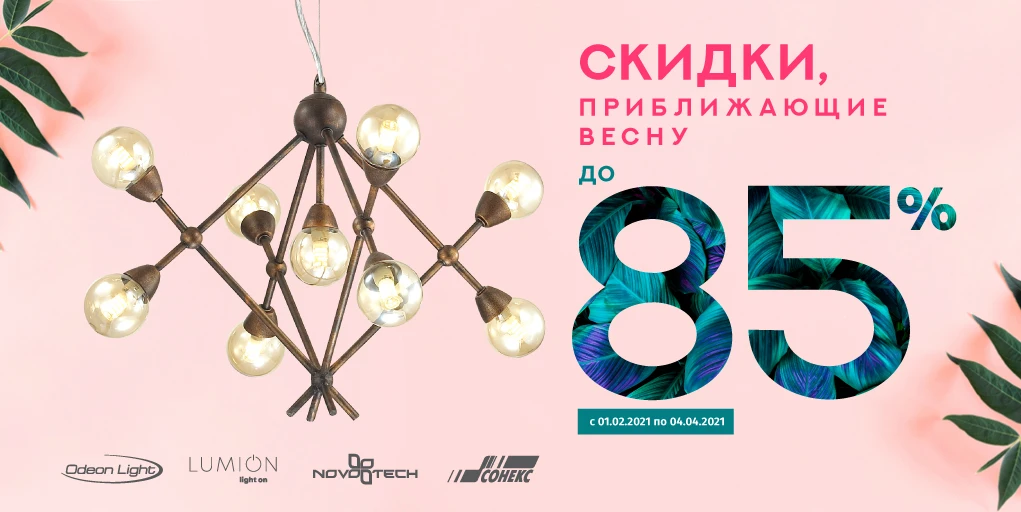 Большая весенняя распродажа светильников на Fedomo.ru - оригинальные люстры, утонченные бра, стильные потолочные и подвесные светильники и многие другие модели освещения от сертифицированных брендов Odeon Light, Novotech, Lumion и Сонекс сейчас со скидками до 85%!