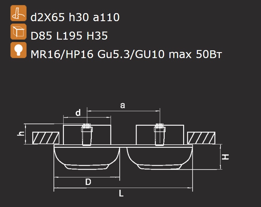 Точечный светильник встроенный 011826 из серии OCULA от компании Lightstar удачно впишется в интерьер экспозиции, гостиной, кухни, магазина, спальни, оформленных в современном стиле. Светильник имеет 2 плафона и 2 лампочки с цоколем GU10 с мощностью 50W, напряжением 220V. Модель поддерживает подключение диммера. Основной цвет и материал арматуры - белый металл, материал плафона - металл. Лампочки в комплект не входят. Габариты модели: длина - 195 мм, ширина - 850 мм, высота - 35 мм. Лучшая цена и условия доставки на Lightstar 011826 в интернет-магазине Fedomo.ru.