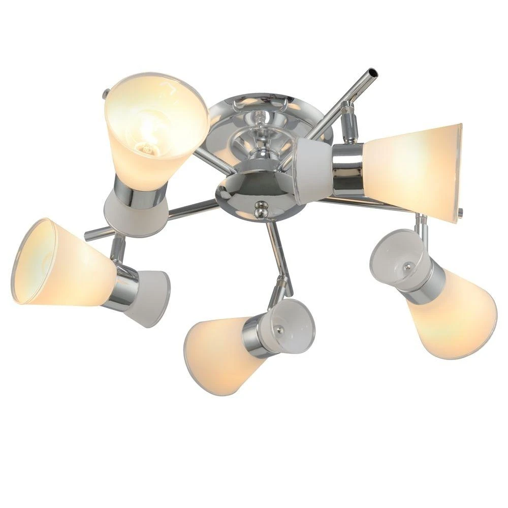 Люстра потолочная 1-8797-5-CR E14 из серии Универсал от компании Максисвет устанавливается на монтажную пластину. Современная люстра прекрасно подойдет в качестве источника основного света для гостиной, прихожей и коридора, спальни, кухни, оформленных в стиле модерн. Основной цвет модели - хром, материал арматуры - металл. Люстра имеет 5 плафонов с направленным вверх и вниз светом, материал изготовления - матовое стекло. Модель оснащена цоколем E14 (5xE14), имеет 5 лампочек с общей мощностью 200W и напряжением 220V. Светильник поддерживает подключение диммера. Габариты: длина - 550 мм, ширина - 550 мм, высота - 240 мм. Лампочки в комплект не входят. Лучшая цена и условия доставки на Максисвет 1-8797-5-CR E14 в интернет-магазине Fedomo.ru.