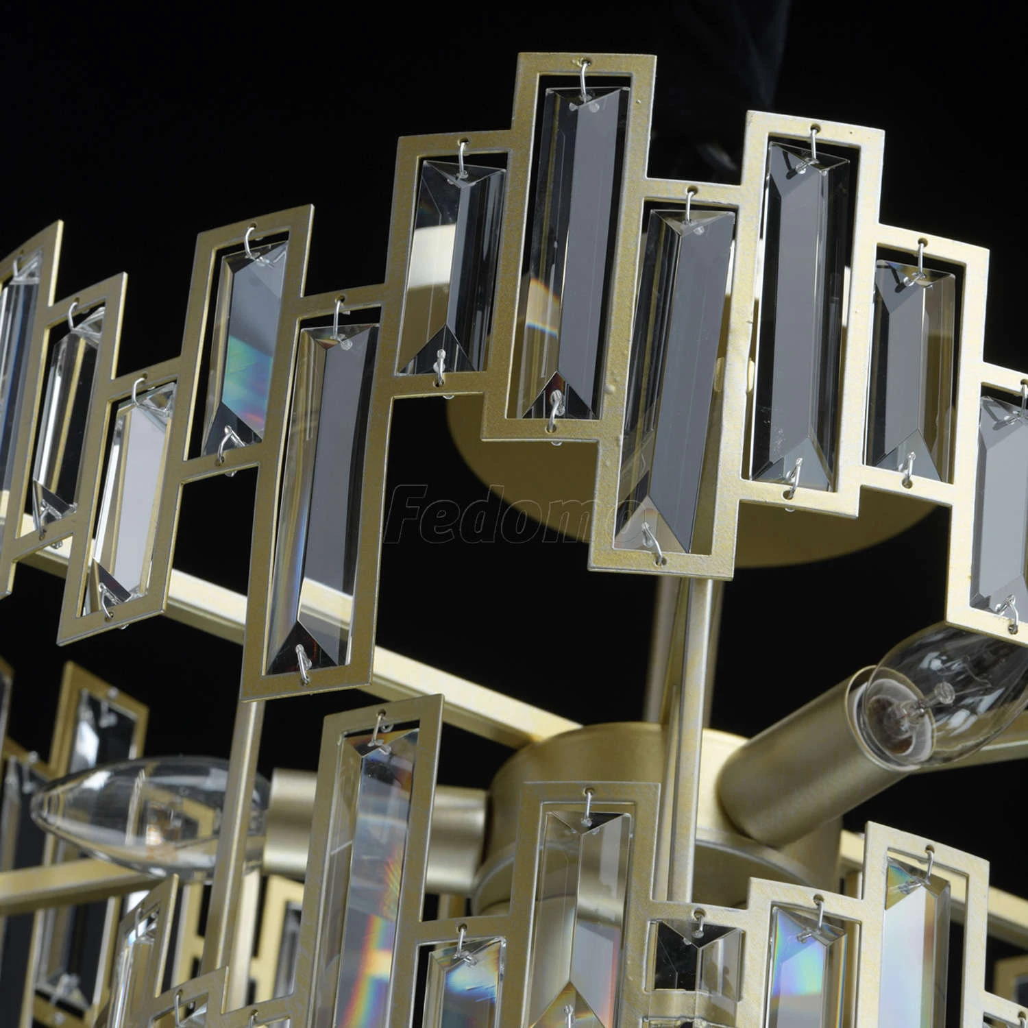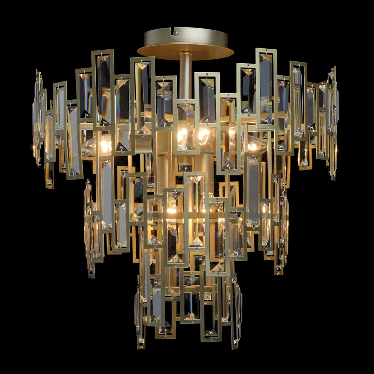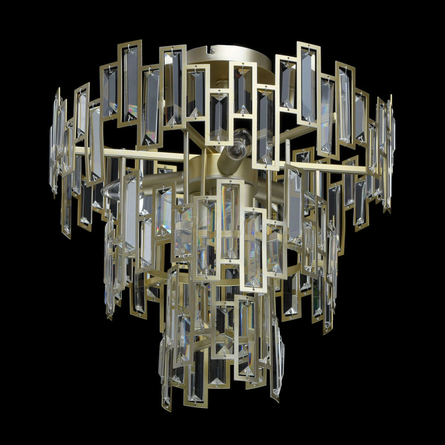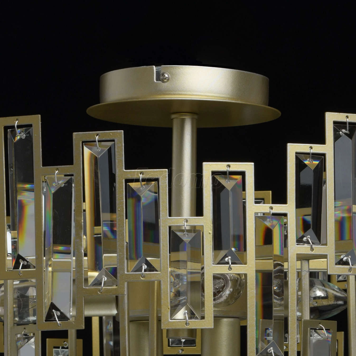 Люстра из коллекции «Монарх» отличается нетривиальным дизайном, который будет эффектно смотреться как в классических интерьерах, так и в современной лофт-обстановке. Основание светильника выполнено из металла матового золотого оттенка и подчеркнуто богаты