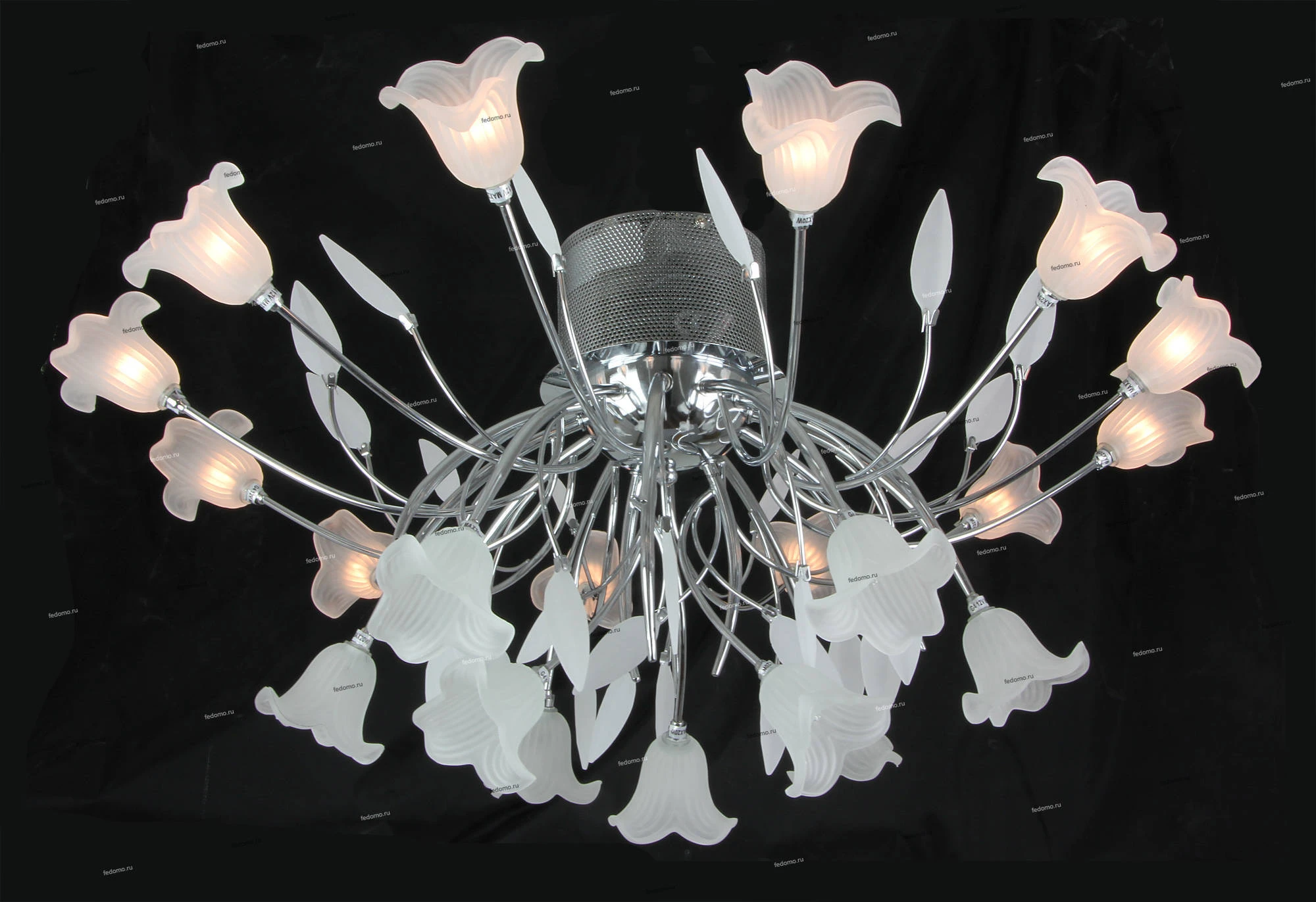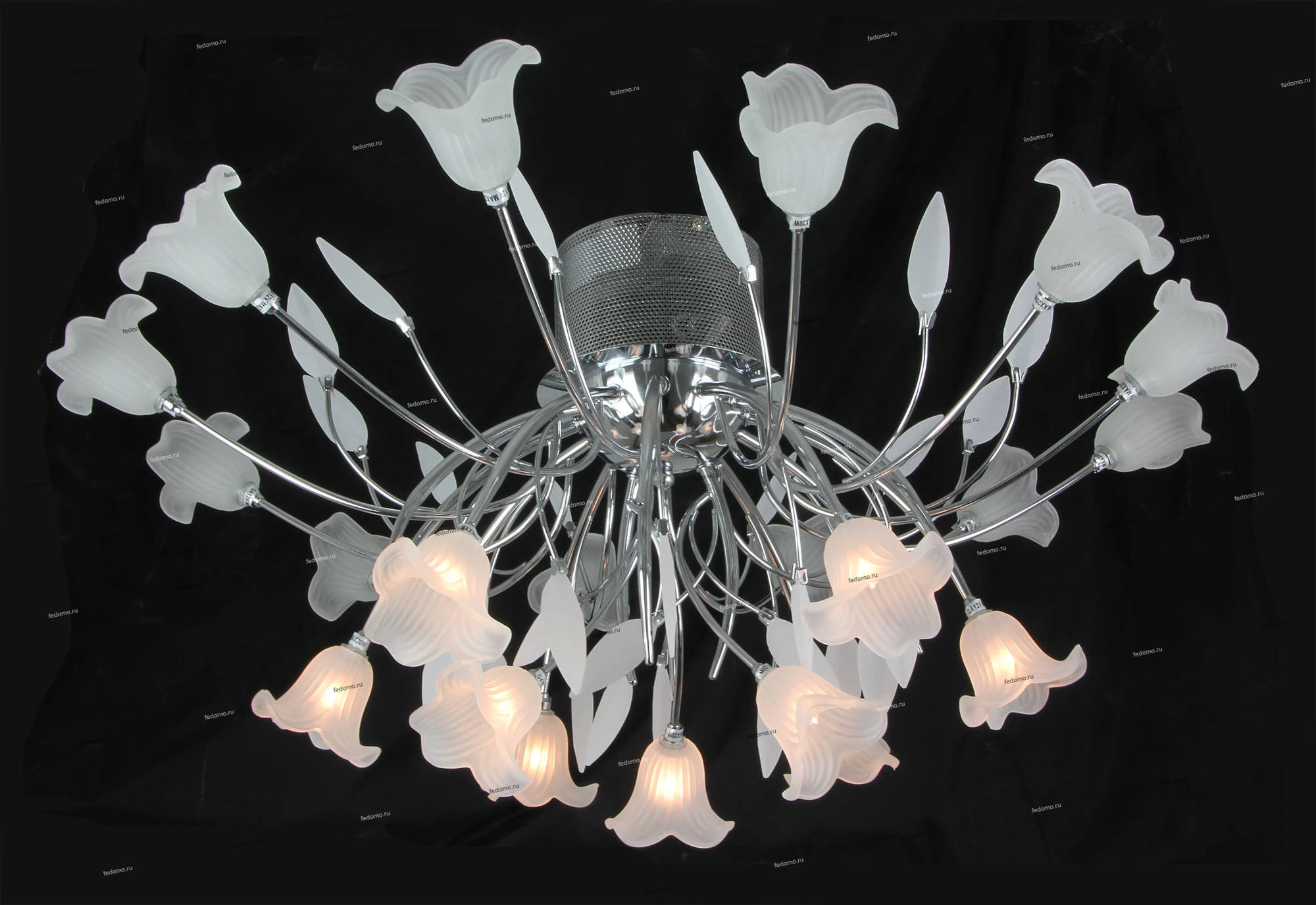 Люстра оснащена пультом дистанционного управления. Пульт позволяет управлять люстрой в трех режимах (включены все плафоны, выключена нижняя группа плафонов - 9 шт. и включена верхняя группа плафонов - 12 шт.).