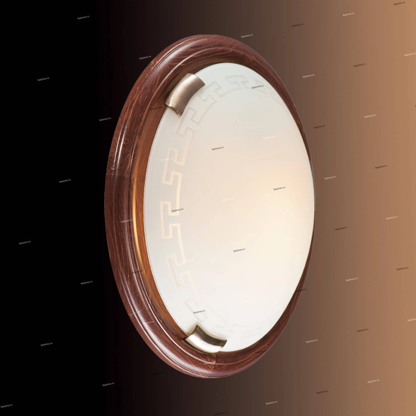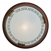 Материалы исполнения База - металл. Плафон - декорированное стекло. Цвет арматуры бронзовый. Плафон в цвете: коричневый. Особенность: полупрозрачный узор на плафоне. Декор рамка, материал декора дерево, цвет коричневый. Наименование 160/K SN 099 св-к GRECA WOOD стекло E27 2*60Вт D360.