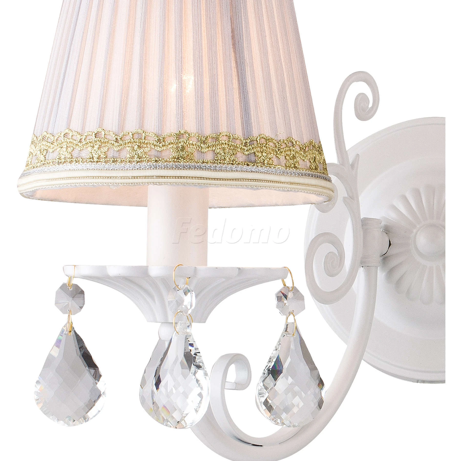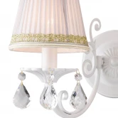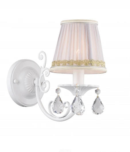 Лампы 1*E14*40W, excluded. Каркас белого матового цвета, абажур из белой хлопковой ткани с узорной золотистой тесьмой, хрустальные подвески высшего качества. Материал и цвет арматуры металл, цвет белый. Плафон белая ткань с золотистой тесьмой. Цвет хрусталя прозрачный. Декор прозрачный хрусталь.