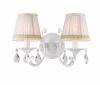 Лампы 2*E14*40W, excluded. Каркас белого матового цвета, абажур из белой хлопковой ткани с узорной золотистой тесьмой, хрустальные подвески высшего качества. Материал и цвет арматуры металл, цвет белый. Плафон белая ткань с золотистой тесьмой. Цвет хрусталя прозрачный. Декор прозрачный хрусталь.