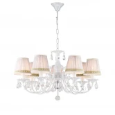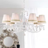 Лампы 7*E14*40W, excluded. Каркас белого матового цвета, абажур из белой хлопковой ткани с узорной золотистой тесьмой, хрустальные подвески высшего качества. Материал и цвет арматуры металл, цвет белый. Плафон белая ткань с золотистой тесьмой. Цвет хрусталя прозрачный. Декор прозрачный хрусталь.