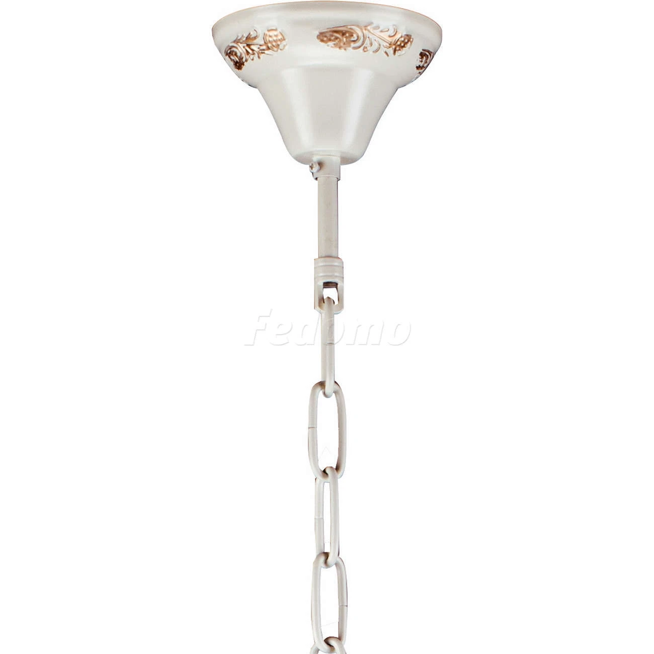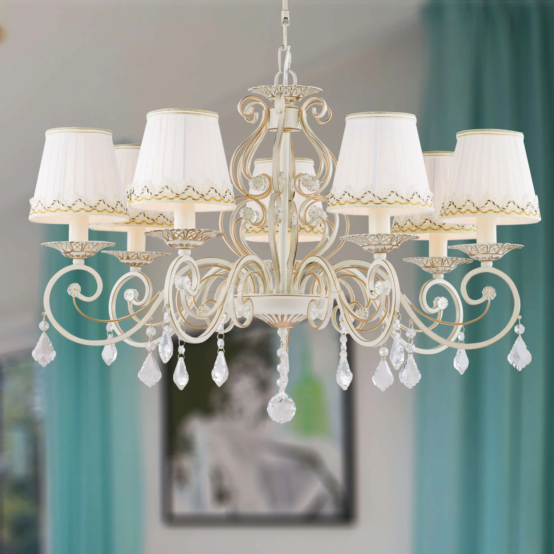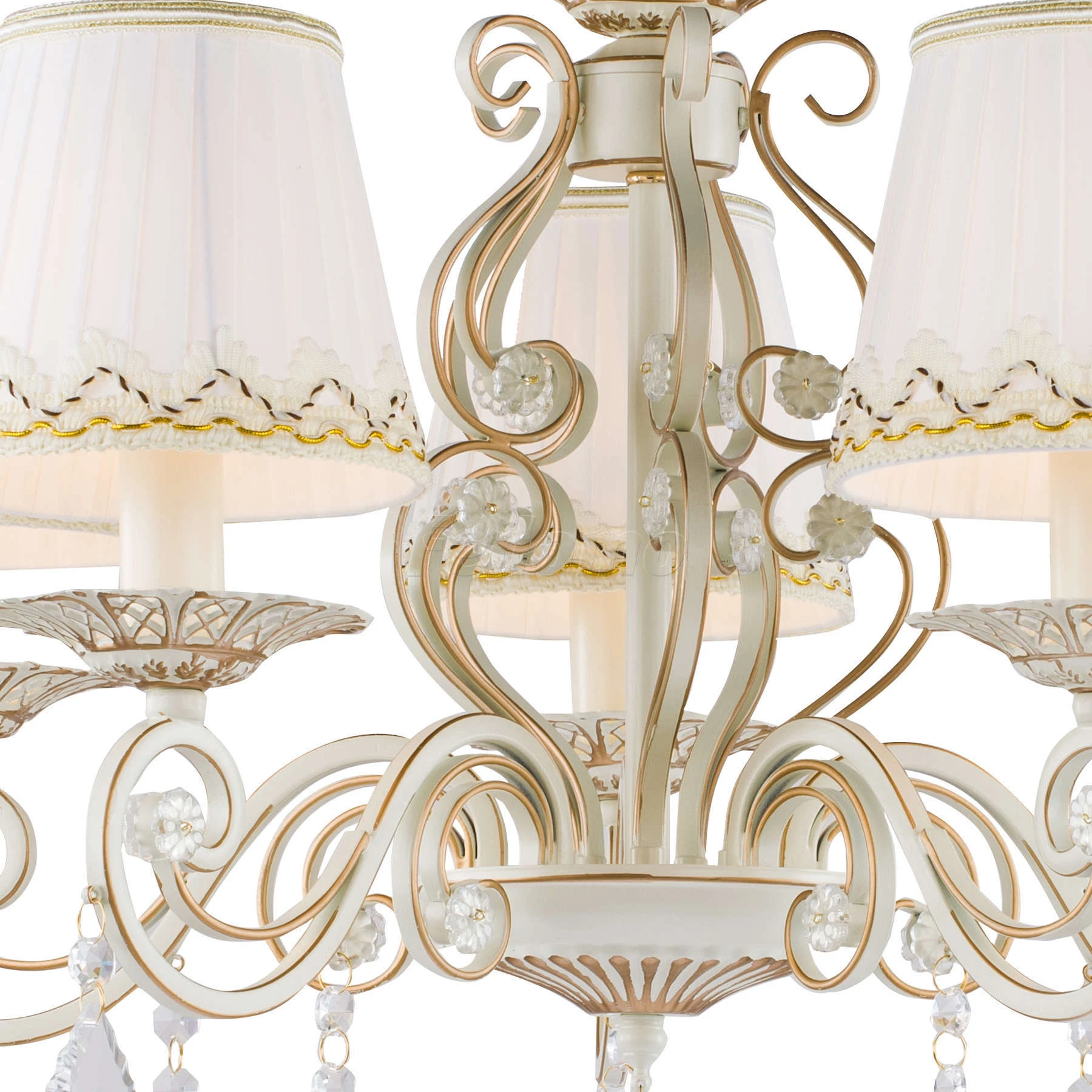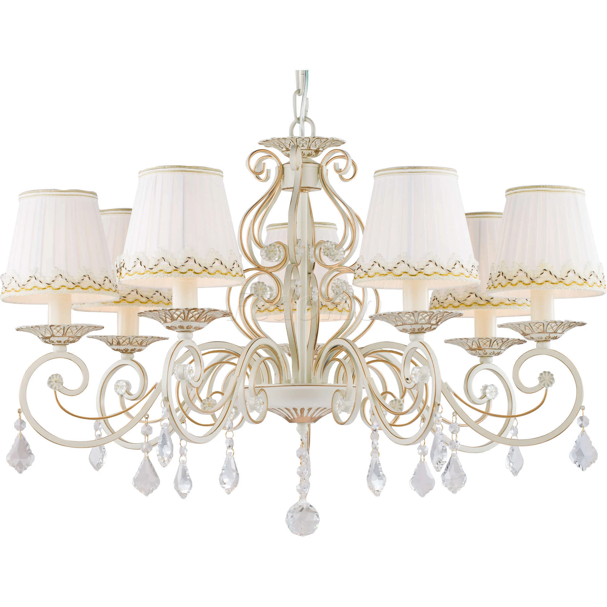 Лампы 7*E14*40W, excluded. Каркас окрашен в цвет слоновой кости с позолотой, абажур из белой ткани украшен тесьмой с золотистым узором, хрустальные подвески высшего качества. Материал и цвет арматуры металл, цвет слоновая кость с золотом. Плафон белая ткань с золотистой тесьмой. Цвет хрусталя прозрачный. Декор прозрачный хрусталь.