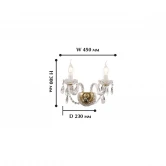 Лампы 2*E14*40W, excluded. Арматура золотого цвета, хрусталь высшего качества и стеклянные рожки и блюдца прозрачного цвета. Материал и цвет арматуры металл, цвет золото. Цвет хрусталя прозрачный. Декор прозрачное стекло, прозрачный хрусталь.