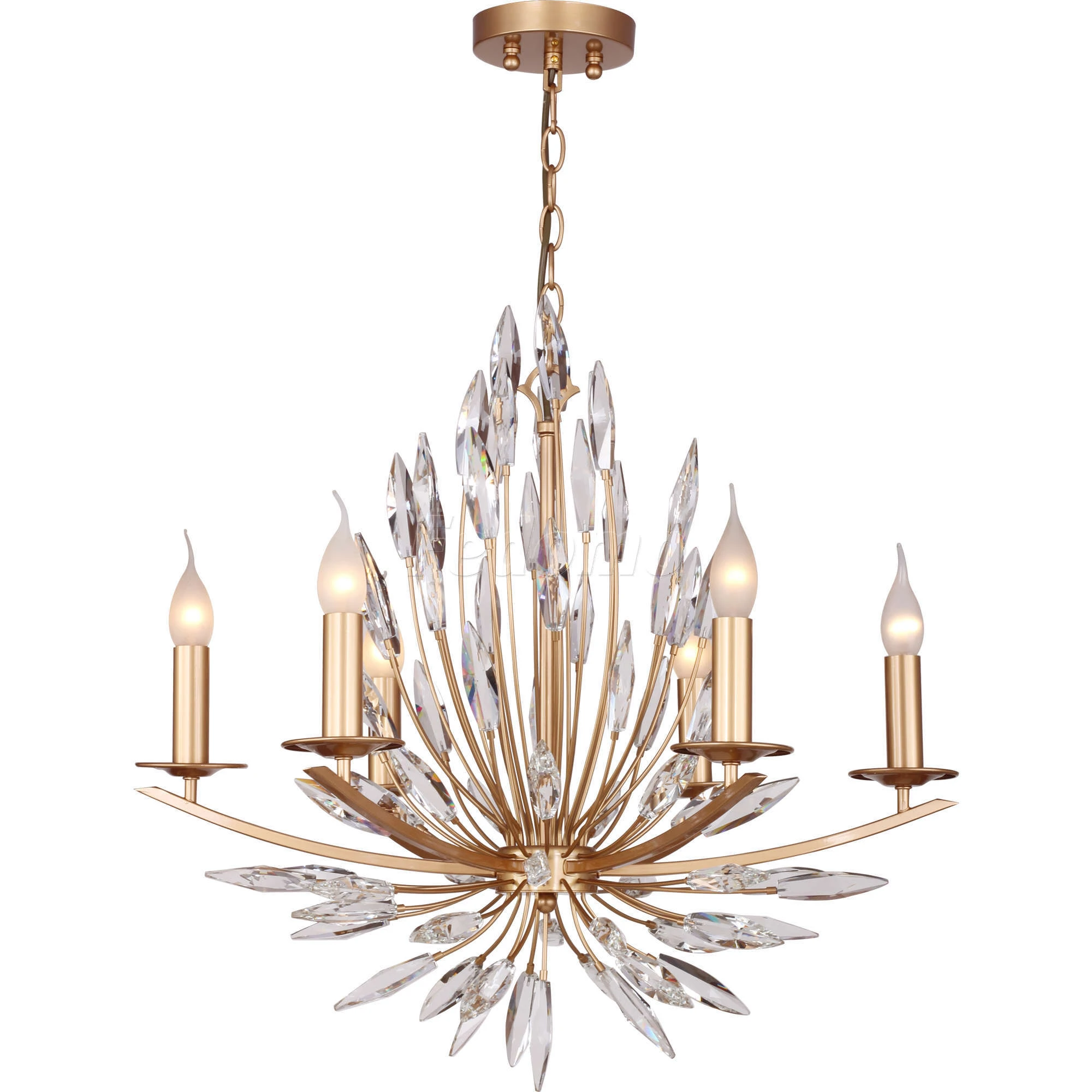 Лампы 6*E14*40W, excluded. Цвет, отделка: арматура в цвете античного золота, хрусталь высшего качества. Материал и цвет арматуры металл, цвет золото. Цвет хрусталя прозрачный. Декор прозрачный хрусталь.
