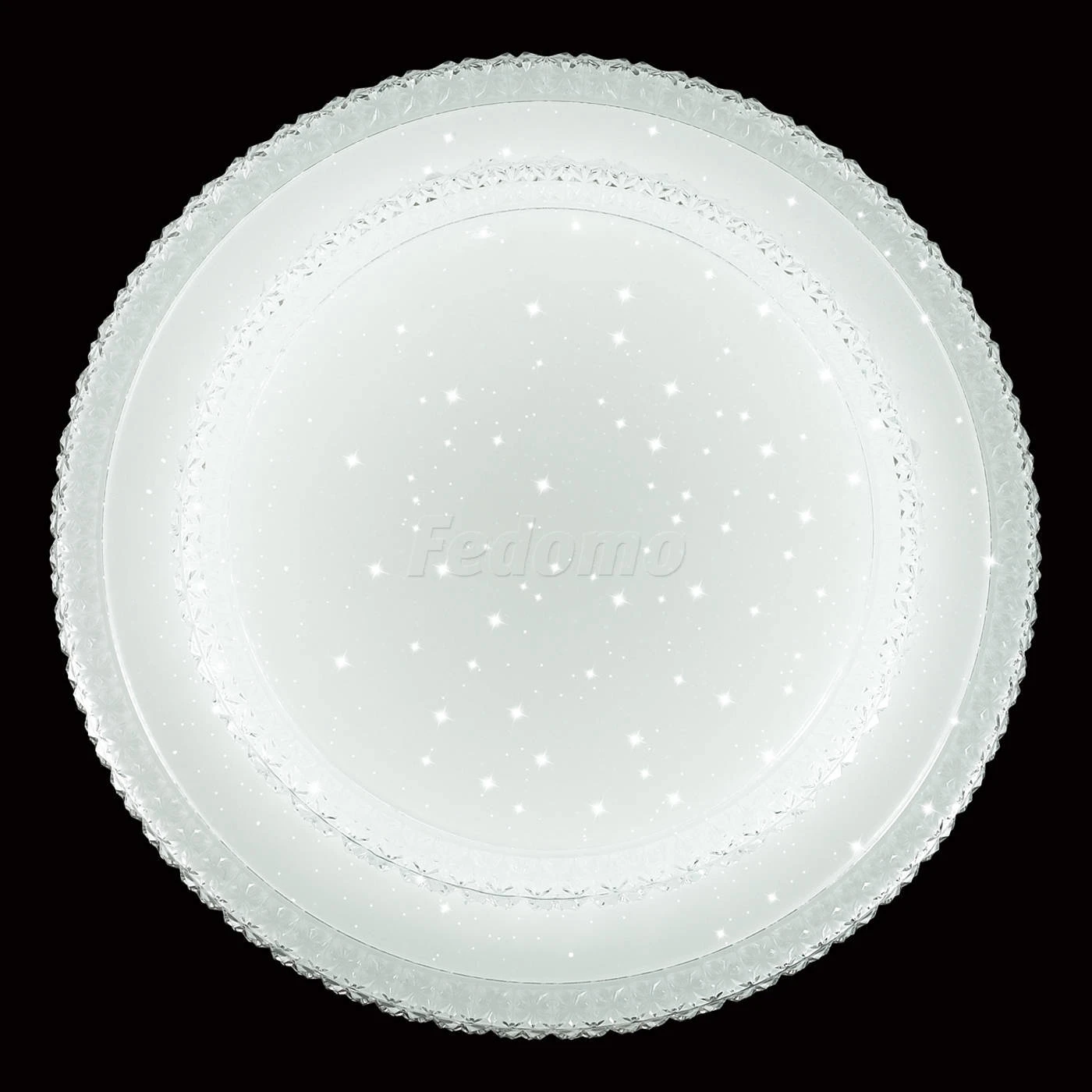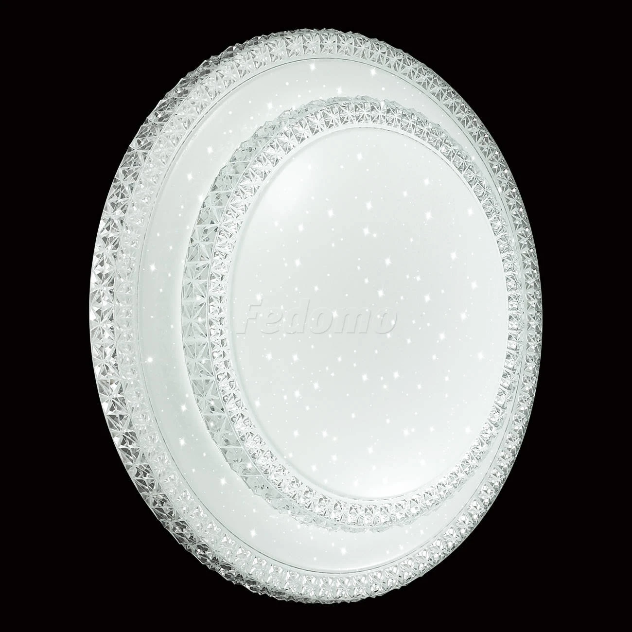 Материалы исполнения База - металл. Плафон - декорированный пластик. Цвет арматуры белый. Плафон в цвете: прозрачный. Особенность: заменяемый LED модуль. Декор рельефный обод с эффектом переливания, материал декора пластик, цвет прозрачный. Светильник 2041/DL серии FLOORS cостоит из металлического основания (базы) и пластикового рассевателя. Материал рассеивателя - высококачественный акрил белого цвета с глянцевой поверхностью, обеспечивающий светильнику равномерное рассеивание и хорошее светопропускание. Форма плафона: круглая, декорирована рельефным, прозрачным ободом с эффектом переливания, а также прозрачными точками, придающими включенному светильнику красивый эффект "звездного мерцания". Степень защиты IP43 позволяет использовать светильник в определенных зонах влажных помещений. В комплект входит заменяемый LED модуль с линзами, мощностью 48Вт, которая соответствует лампе накаливания 350Вт. А также пульт ДУ, с помощью которого осуществляется плавное изменение цветовой температуры 3000-6500К, изменение яркости, переход в режим переключения холодного/белого/теплого/ночного света. Наименование 2041/DL SN 056 св-к FLOORS пластик LED 48Вт 3000-6500K D350 IP43 пульт ДУ.