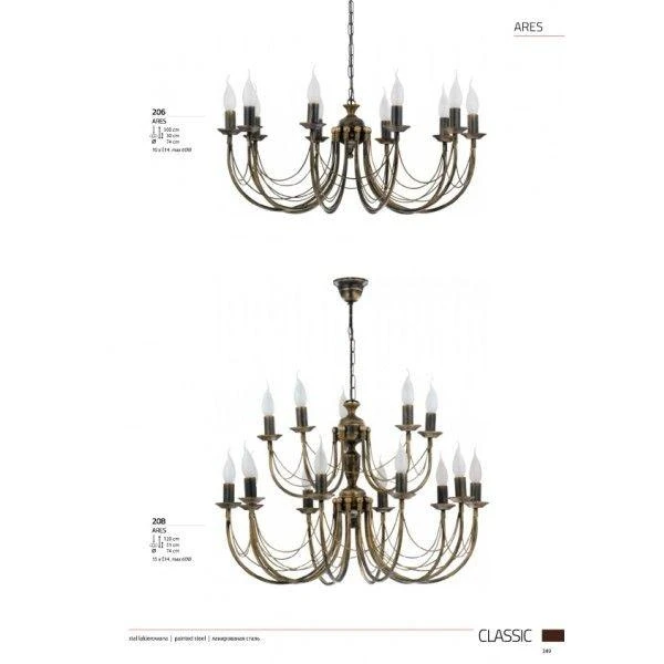 Люстра подвесная большая 206 из серии Ares от компании Nowodvorski регулируется по высоте и устанавливается на металлический крюк. Классическая люстра в виде подсвечника прекрасно подойдет в качестве источника основного света для гостиной, кафе, холла, оформленных в стиле прованс. Основной цвет модели - бронза, материал арматуры - металл. Модель оснащена цоколем E14 (10xE14), имеет 10 лампочек с общей мощностью 600W и напряжением 220V. Светильник поддерживает подключение диммера. Габариты: диаметр - 740 мм. Лампочки в комплект не входят. Лучшая цена и условия доставки на Nowodvorski 206 в интернет-магазине Fedomo.ru.