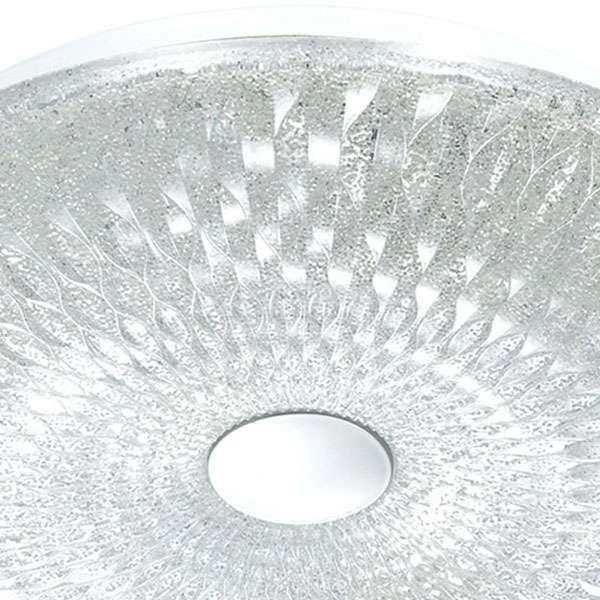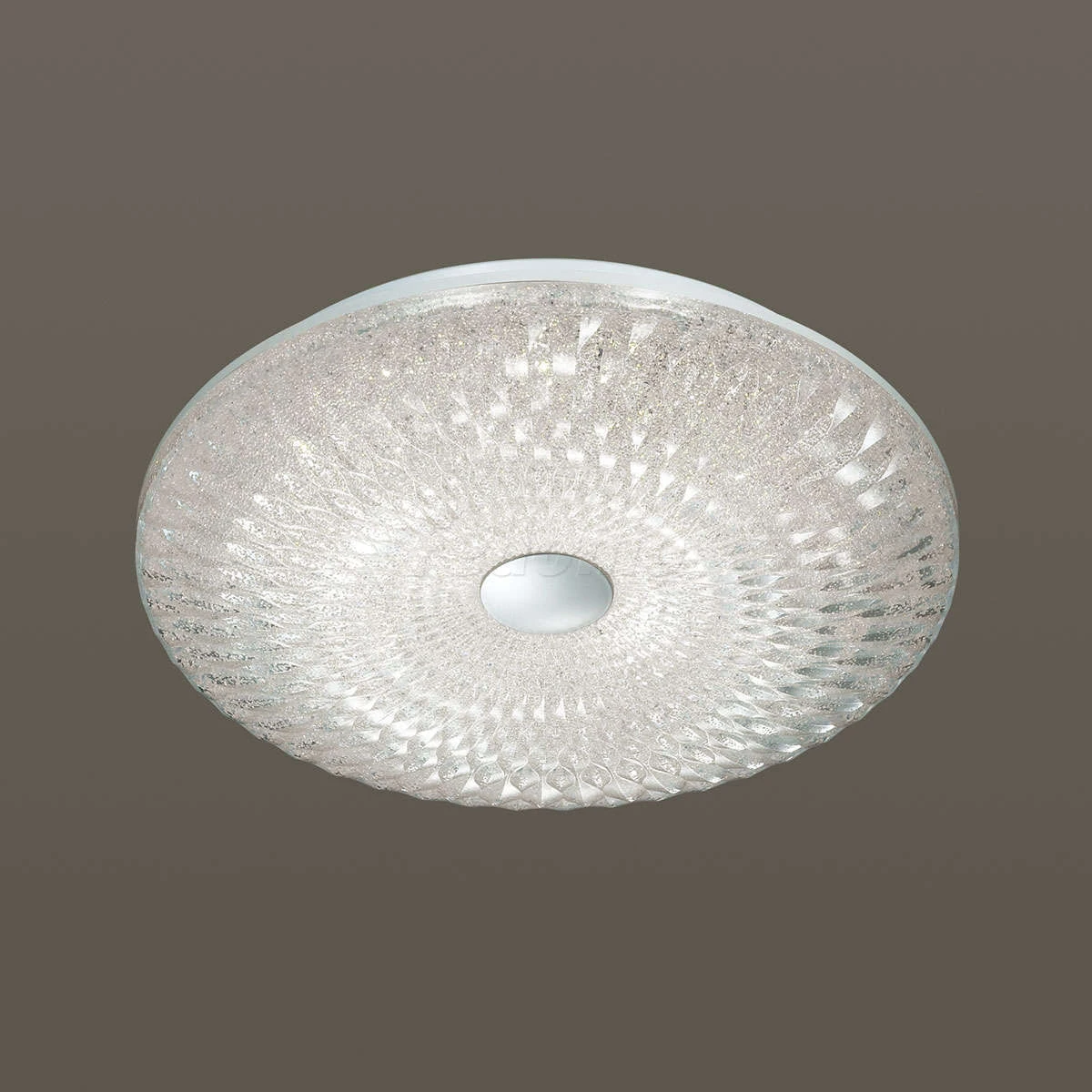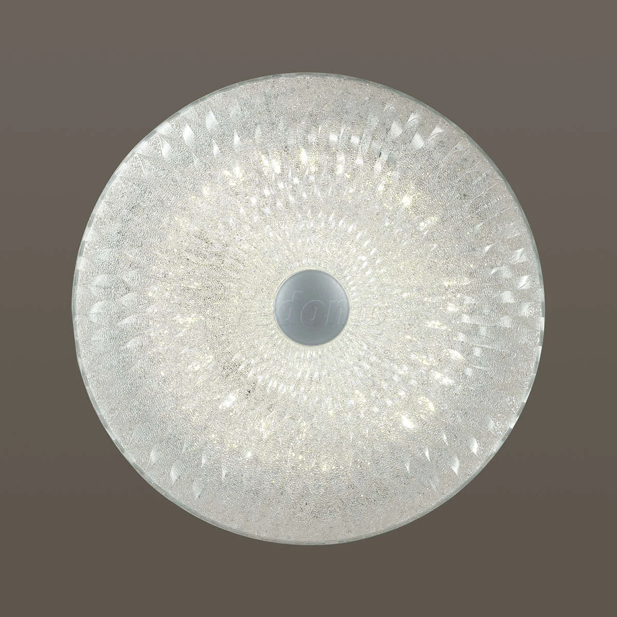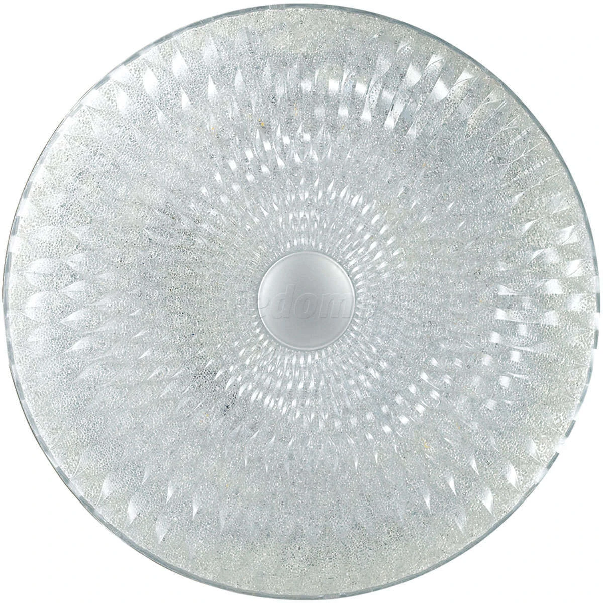 Материалы исполнения База - металл. Плафон - декорированный пластик. Цвет арматуры белый. Плафон в цвете: белый. Особенность: заменяемый LED модуль. Декор рельефная структура "под хрусталь", материал декора пластик, цвет белый. Светильник 2094/EL серии FIOLA cостоит из металлического основания (базы) и пластикового рассевателя. Материал рассеивателя - высококачественный полупрозрачный акрил с нанесением пластиковой крошки, обеспечивающий светильнику равномерное рассеивание и хорошее светопропускание. Форма плафона: круглая, декорирована рельефной структурой "под хрусталь", которая придает включенному светильнику красивый эффект переливания. Степень защиты IP43 позволяет использовать светильник в определенных зонах влажных помещений. В комплект входит заменяемый LED модуль с линзами, мощностью 72Вт, которая соответствует лампе накаливания 520Вт. А также пульт ДУ, с помощью которого осуществляется плавное изменение цветовой температуры 3000-6500К, изменение яркости, переход в режим переключения холодного/белого/теплого/ночного света. Наименование 2094/EL SN 009 св-к FIOLA пластик LED 72Вт 3000-6500К D500 IP43 пульт ДУ.