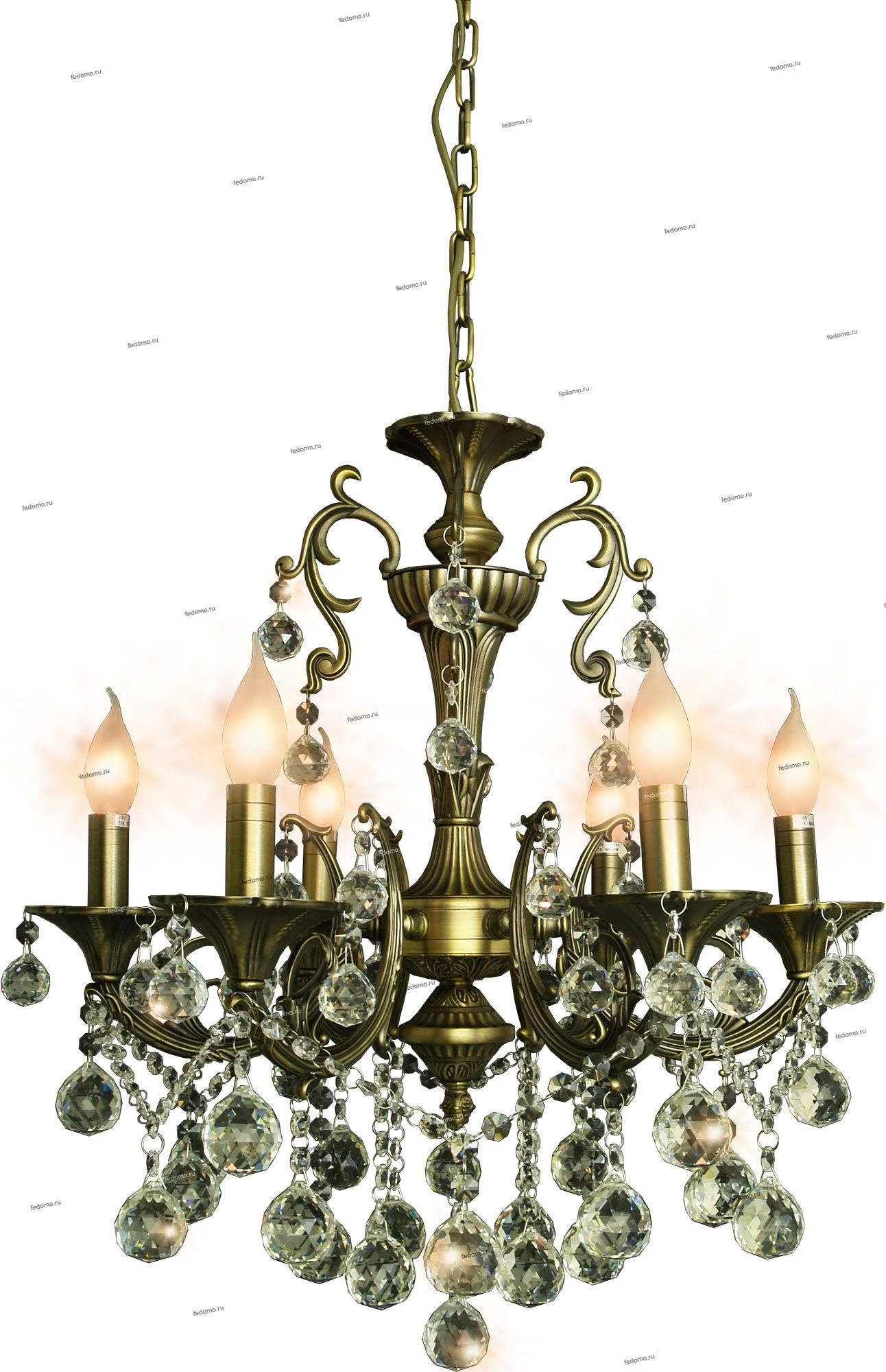 Люстра декорирована хрустальными подвесками. Минимальная высота люстры 70 см.