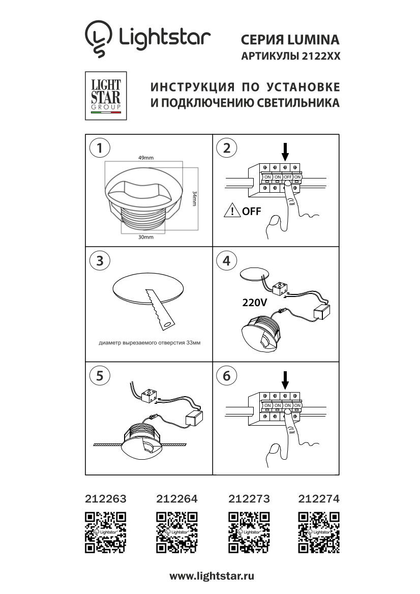 Подсветка для лестниц и ступеней встраиваемая светодиодная Lightstar Lumina 212263 от итальянского производителя Lightstar исполнена в белом цвете из металла. Модель имеет плафон из металла и пластика и подходит для размещения на потолке в прихожей и коридоре, кафе, кухне, магазине в стиле модерн. Диоды обладают мощностью 3W, цветовой температурой 3000К и освещают площадь до 1 кв. м. Световой поток 180 лм. Питание от сети 220V. Монтаж производится на прижимной механизм. Срок службы ламп составит не менее 20000 ч. Высота — 14 мм, диаметр — 49 мм. Заказывайте Lightstar 212263 онлайн по низкой цене с гибкими условиями доставки на Fedomo.ru!