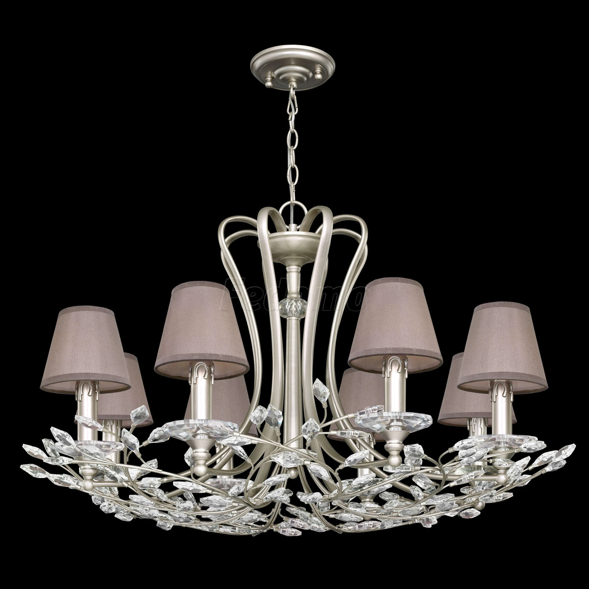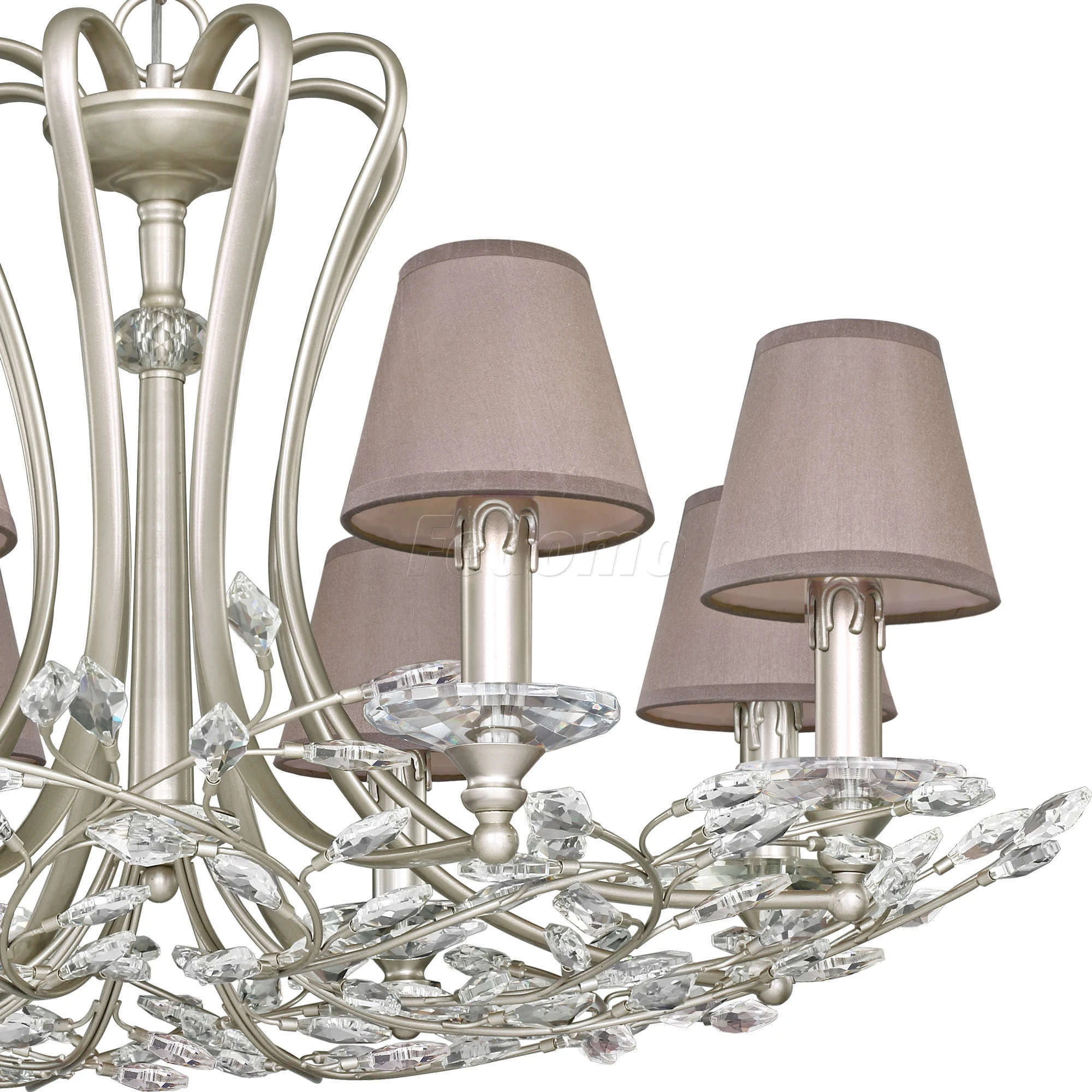Лампы 8*E14*40W, excluded. Материал и цвет арматуры металл, цвет светлое золото. Плафон ткань светло-серого цвета. Цвет хрусталя прозрачный. Декор прозрачный хрусталь.