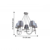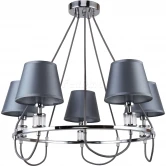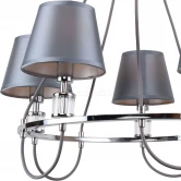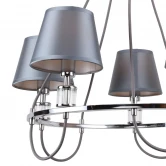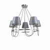 Лампы 5*E14*40W. Каркас цвета хром декорирован тканевыми абажурами из серого атласа. Рожки дополняют стеклянные цилиндры и провода в серой декоративной оплетке. Материал и цвет арматуры металл, хром. Плафон серая ткань. Декор стекло, прозрачный.