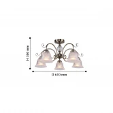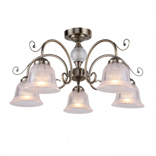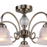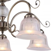 Лампы 5*E14*40W. Каркас в цвете античная бронза дополнен стеклянным декором и полупрозрачными узорными плафонами. Материал и цвет арматуры металл, античная бронза. Плафон полупрозрачное узорное стекло.