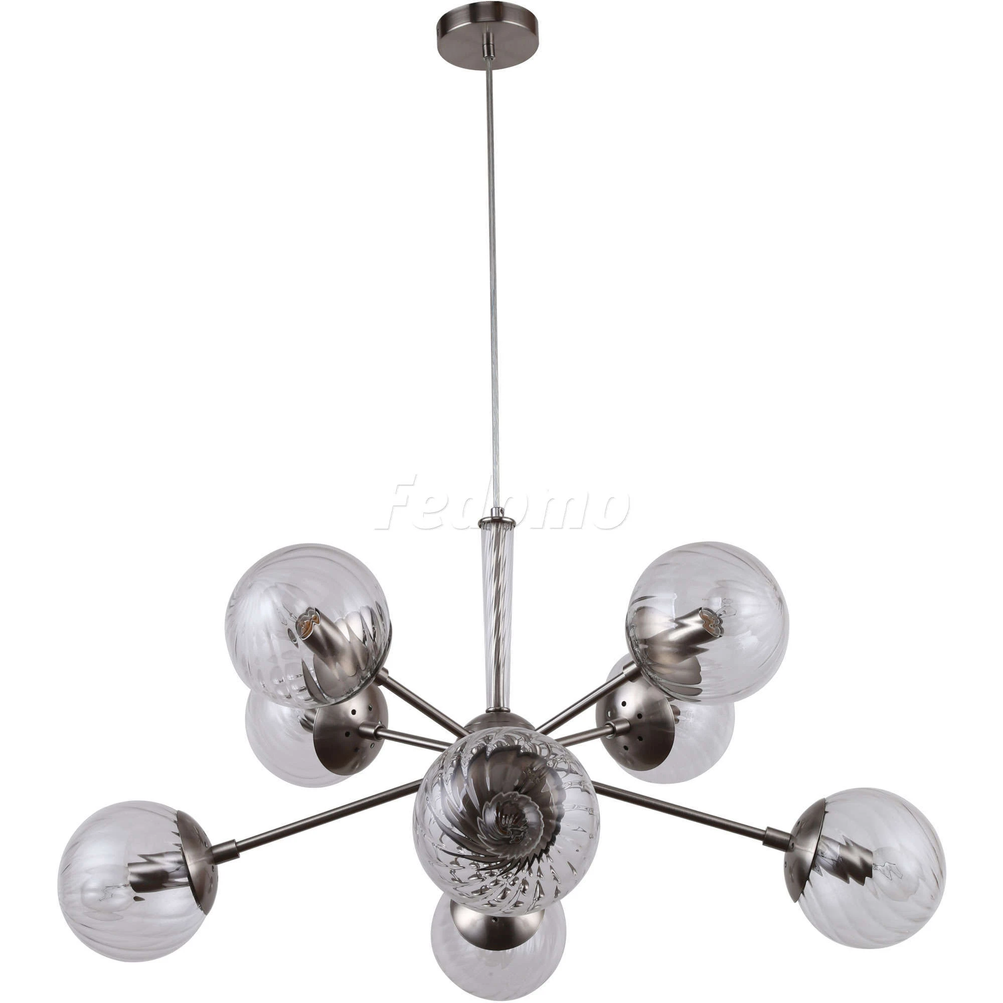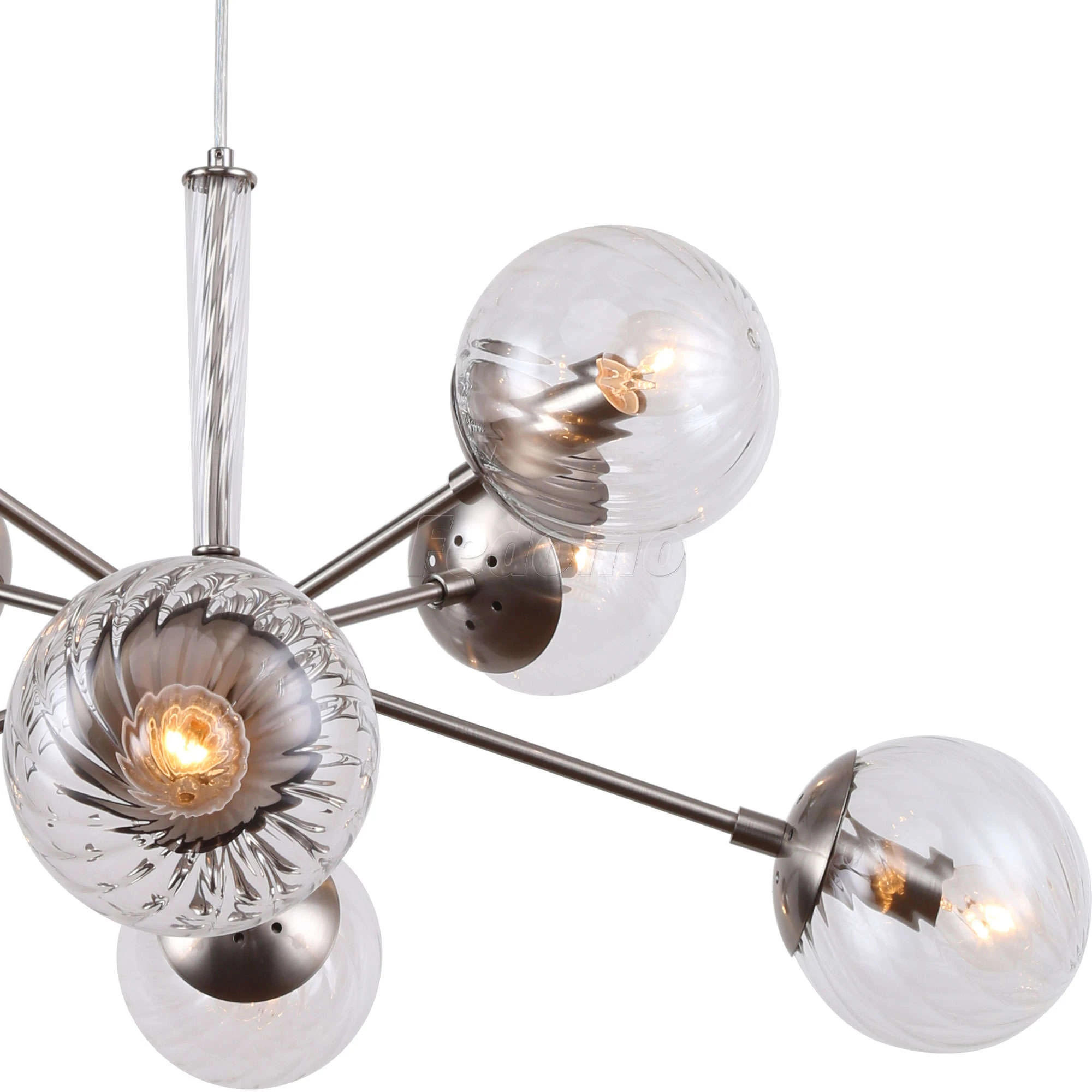 Лампы 8*E14*40W. Каркас цвета никель декорирован стеклянным рифленым цилиндром и рожками, напоминающими молекулу благодаря стеклянным шарообразным плафонам. Меняя длину провода люстры можно адаптировать к высоте потолка. Материал и цвет арматуры металл, никель. Плафон выдувное прозрачное стекло.