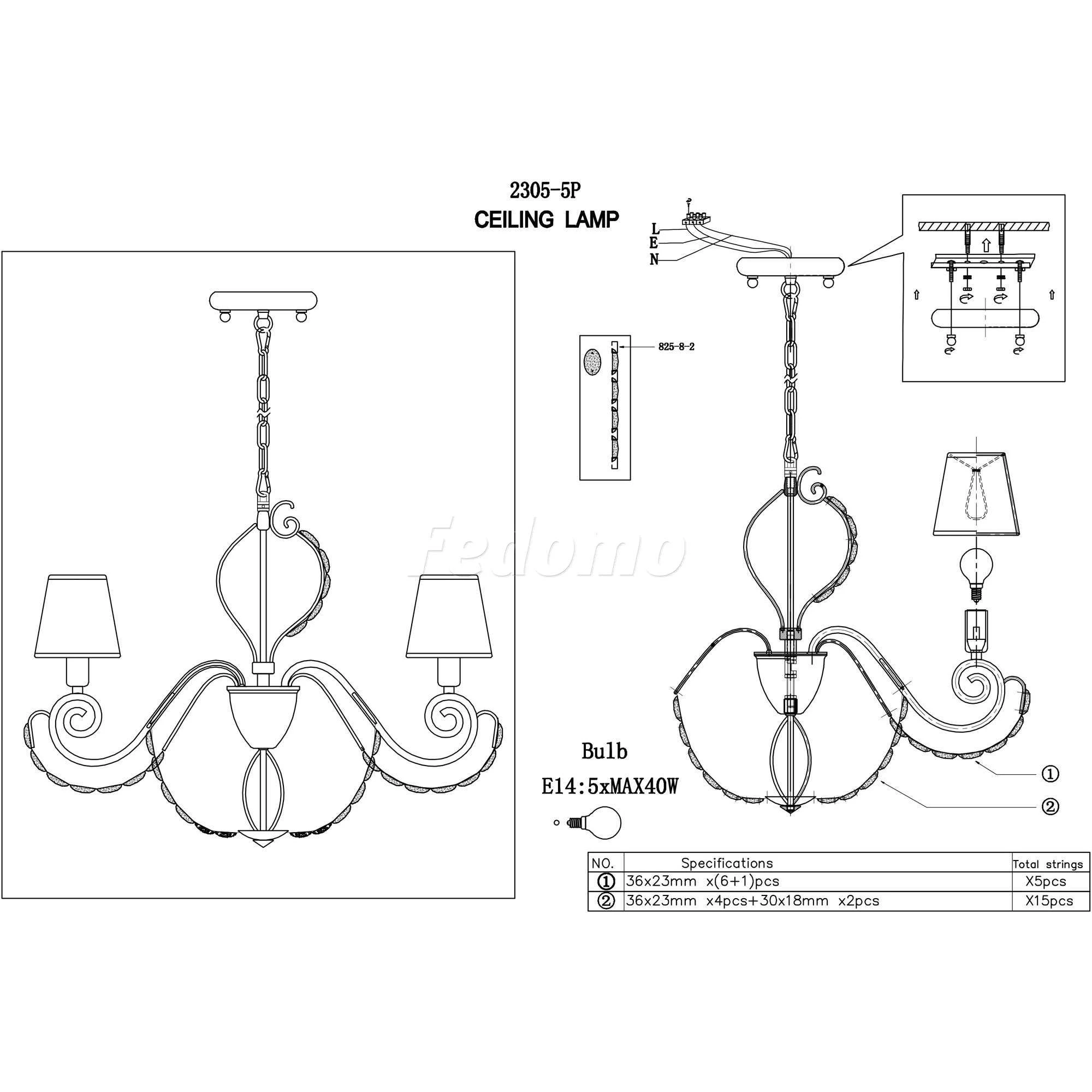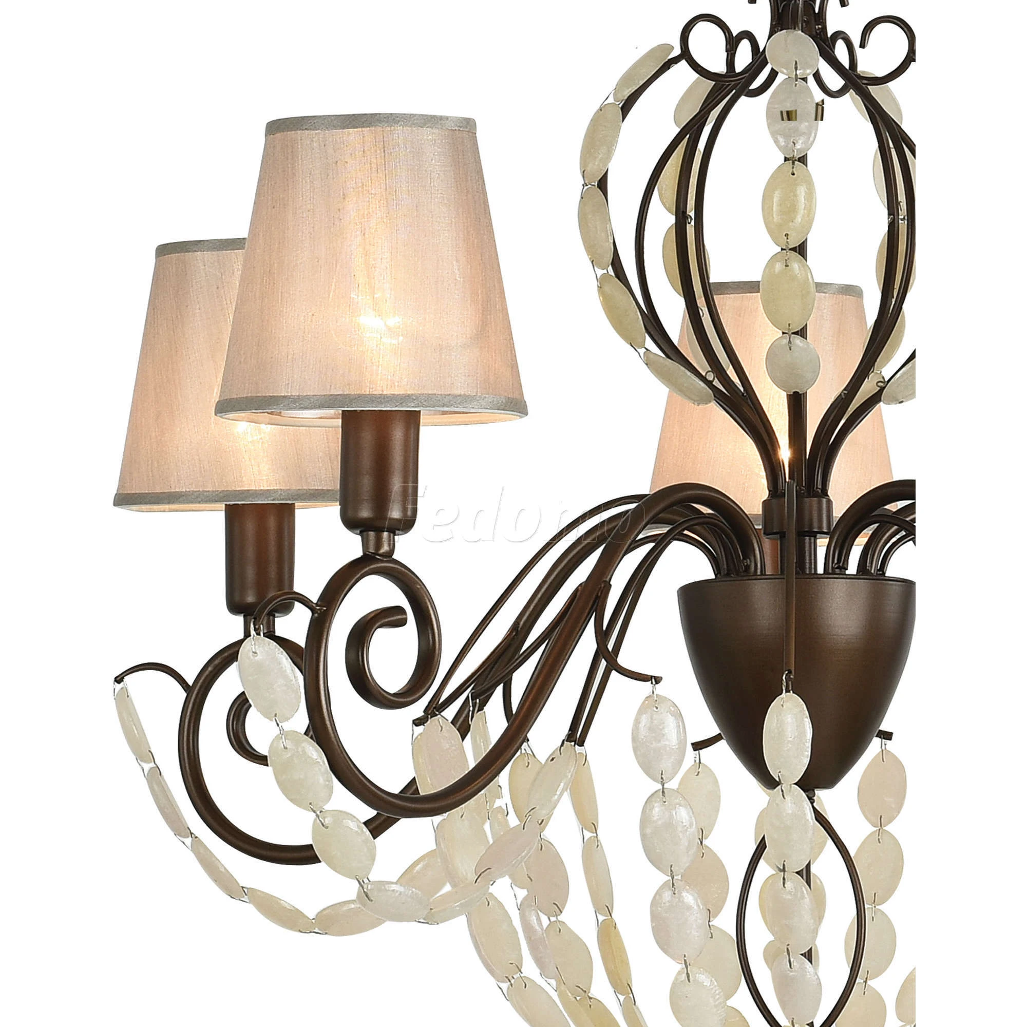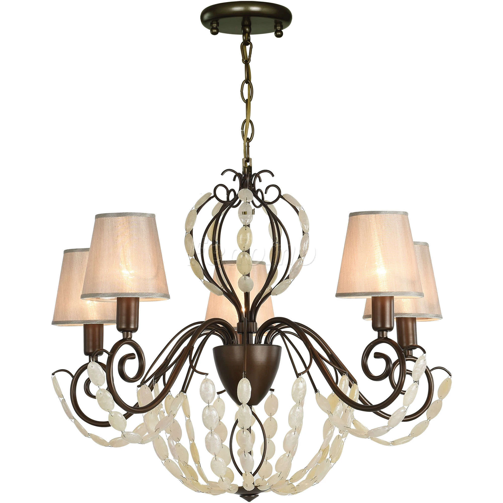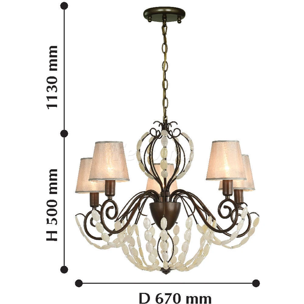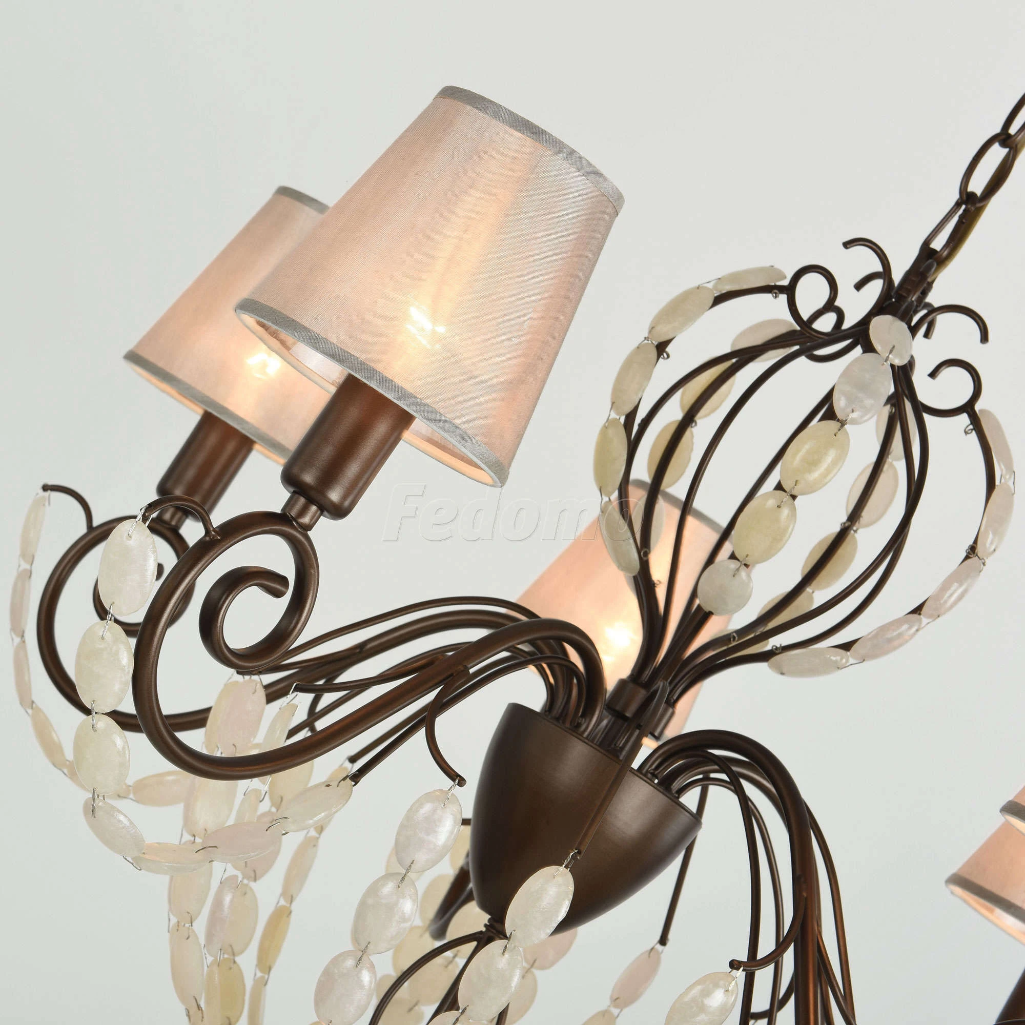 Лампы 5*E14*40W, excluded. Материал и цвет арматуры металл, цвет коричневый. Плафон кремовая атласная ткань с серой тесьмой. Декор стеклянные перламутровые бусины.