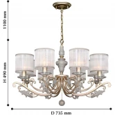Лампы 8*E14*40W, excluded. Материал и цвет арматуры металл, цвет перламутровое золото и светло-серый. Плафон белая органза. Декор металл, цвет перламутровое золото и светло-серый.