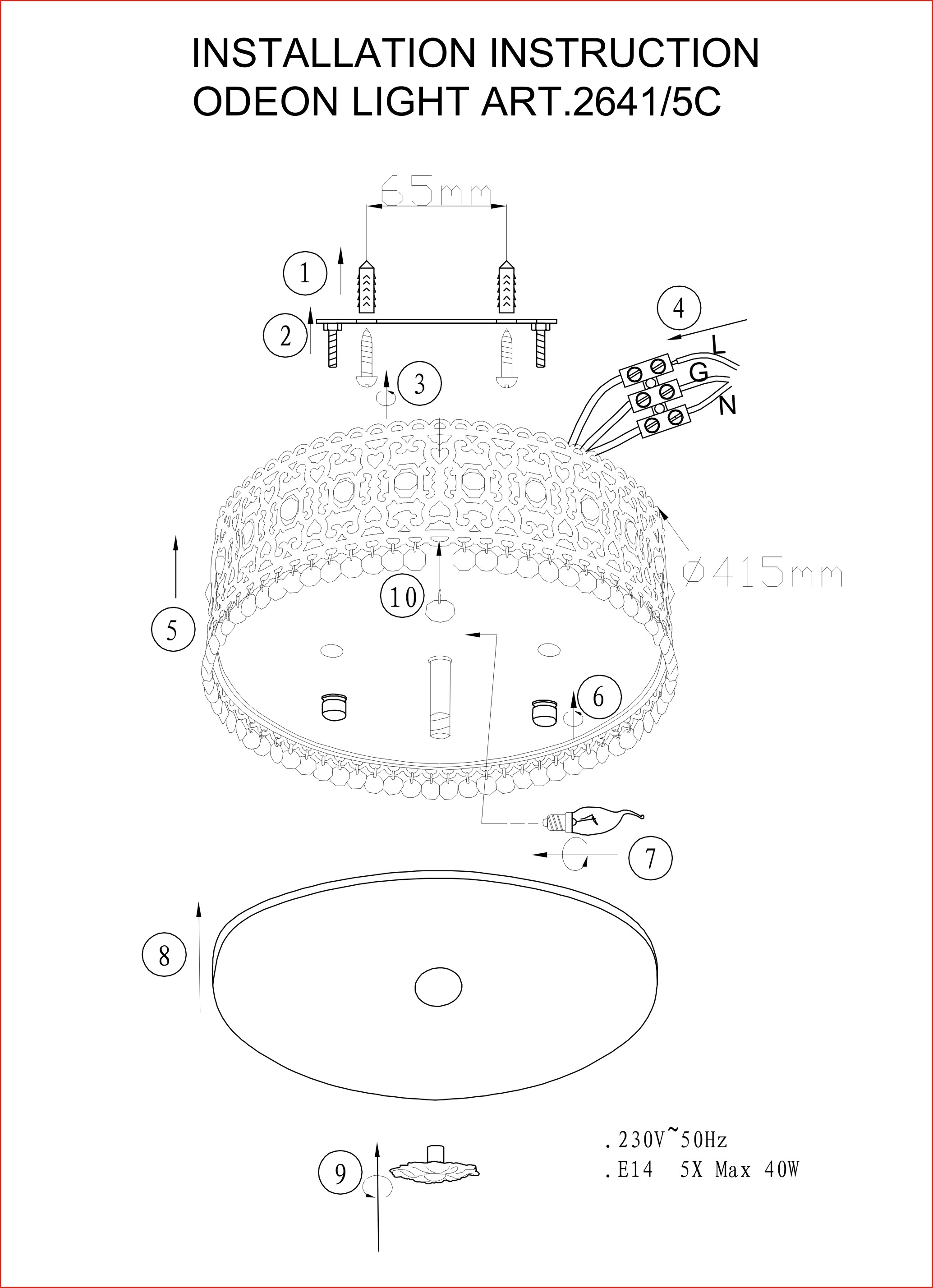 Материалы исполнения плафон: в виде металлического каркаса с каленым стеклом, арматура: металл, декор: хрусталь. Цвет арматуры бронзовый. Плафон в цвете: бронзовый. Декор подвеска, материал декора хрусталь, цвет прозрачный. Роскошная люстра 2641/5C состоит из металлического каркаса цвета "состаренной" бронзы с каленым стеклом. Нежный ажур на стекле, красочные узоры, а также высококачественный хрусталь, обрамляющий основание каркаса, делают эту модель очень экзотичной. Цоколь E14. Мощность 5*40W. Нет ламп в комплекте. Наименование 2641/5C ODL14 485 "под бронзу"/хрусталь Потолочн светильник E14 5*40W 220V Salona.