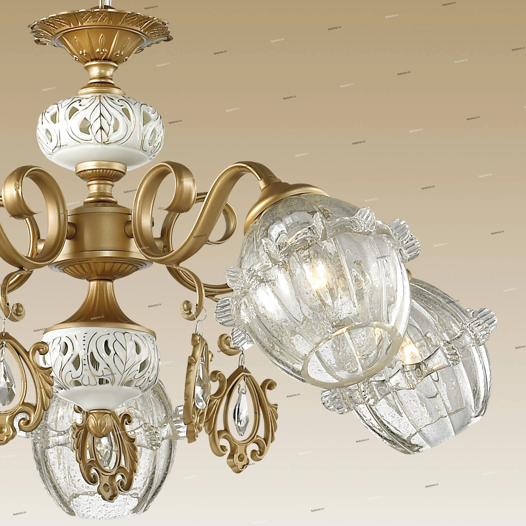 Плафоны на люстре выполнены из прозрачного стекла с изящно переплетенным кантом по центру, хрустальных подвесок, необычно оформленных в декоративкую рамку, и арматуры цвета бронзы.