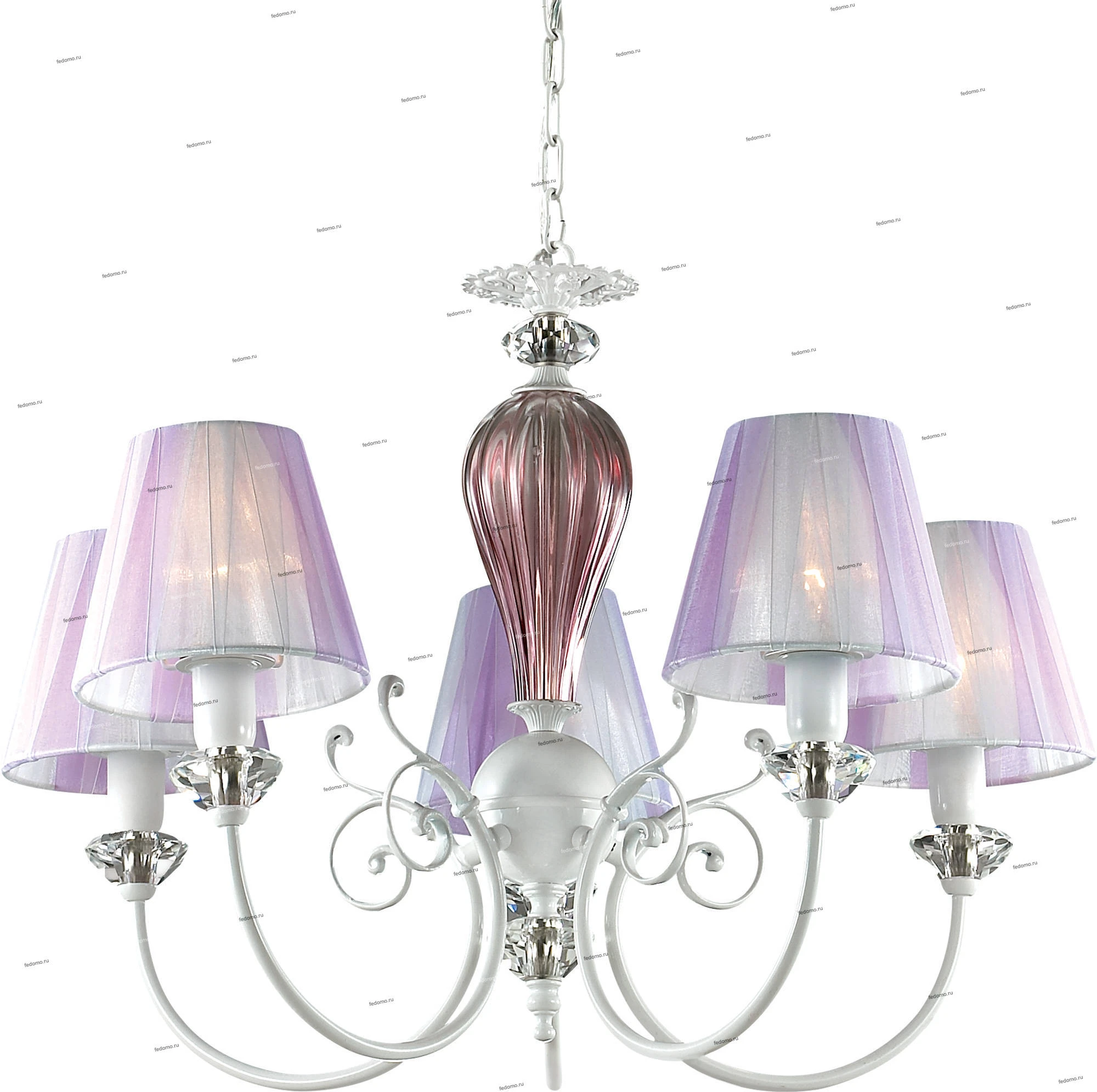 Материалы исполнения плафон: абажур из ткани органза, арматура: металл, декор: сливовое стекло, стеклянные вставки на штанге. Цвет арматуры белый. Плафон в цвете: фиолетовый. Люстра 2889/5 серии Madina выполнена в белом цвете. Декор люстры выполнен из фиолетового стекла, тканевые абажуры с легкой розовой вуалью. Цоколь Е14. Мощность 5х60W. Тип крепления "крюк". Нет ламп в комплекте. Наименование 2889/5 ODL16 444 белый/фиолет. и прозр. стекло/абажур ткань Люстра E14 5*60W 220V MADINA.