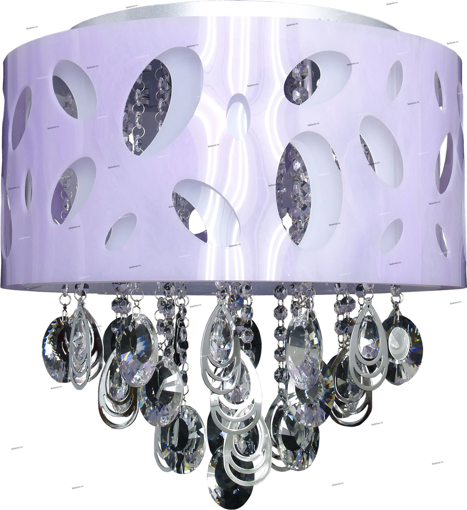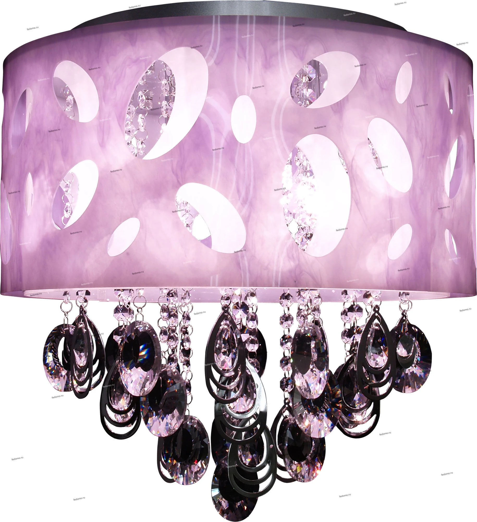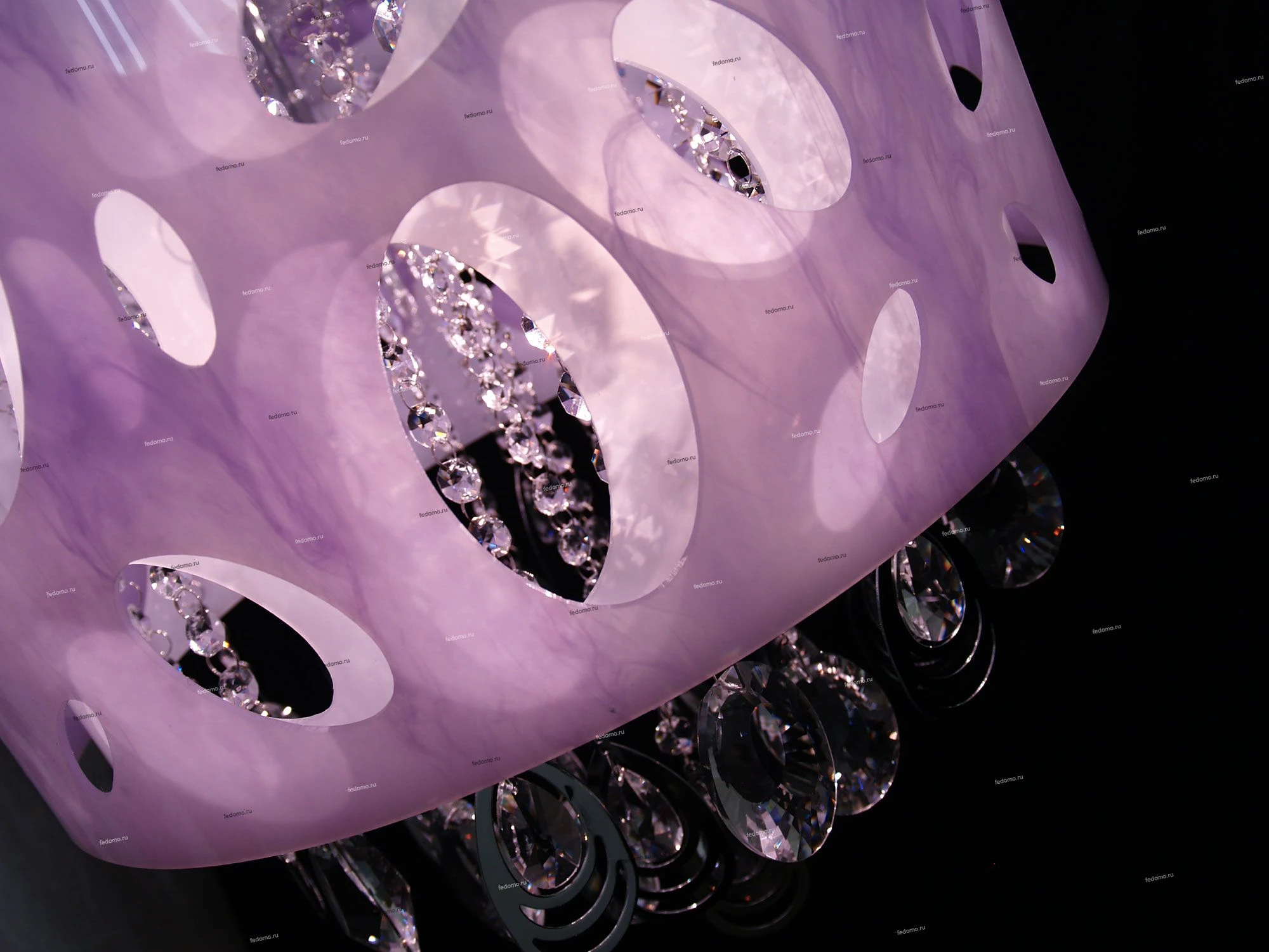 Лампочки входят в комплект поставки. Галогеновая потолочная люстра работает в двух режимах свечения. В первом режиме светится основная группа ламп, во втором режиме дополнительная группа ламп, а в третьем режиме светятся обе группы ламп. Плафон люстры состоит из двух пластиковых цилиндров. Один цилиндр белого цвета, а другой лилового. В качестве источника света в люстре применяются галогеновые лампы.