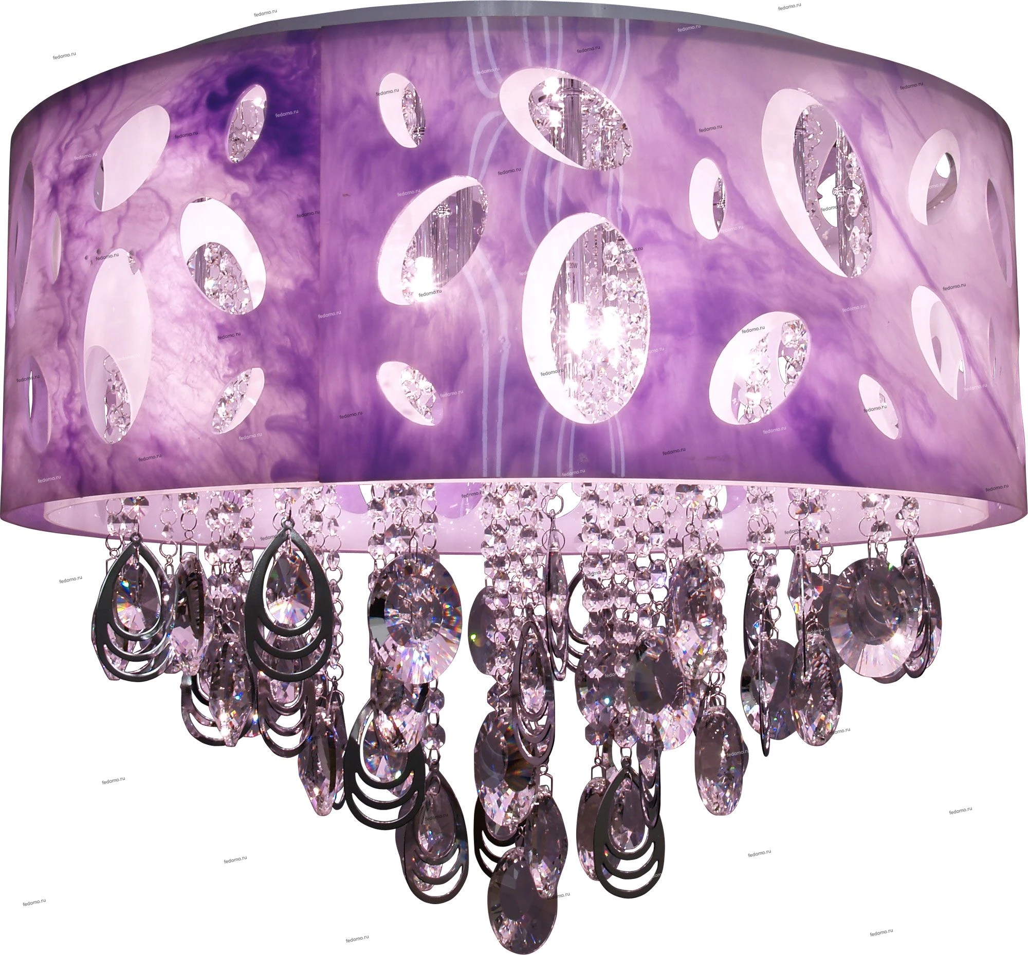 Лампочки входят в комплект поставки. Галогеновая потолочная люстра работает в двух режимах свечения. В первом режиме светится основная группа ламп, во втором режиме дополнительная группа ламп, а в третьем режиме светятся обе группы ламп. Плафон люстры состоит из двух пластиковых цилиндров. Один цилиндр белого цвета, а другой лилового. В качестве источника света в люстре применяются галогеновые лампы.