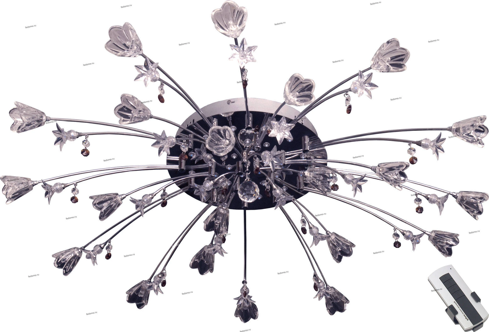 В комплект входят лампочки и пульт дистанционного управления. Люстра оснащена дополнительной светодиодной подсветкой.