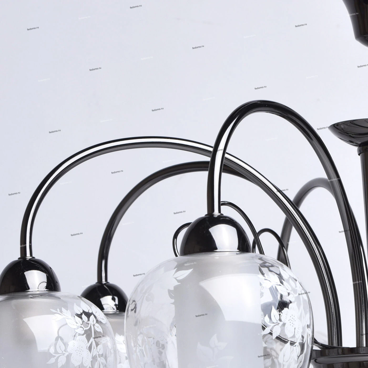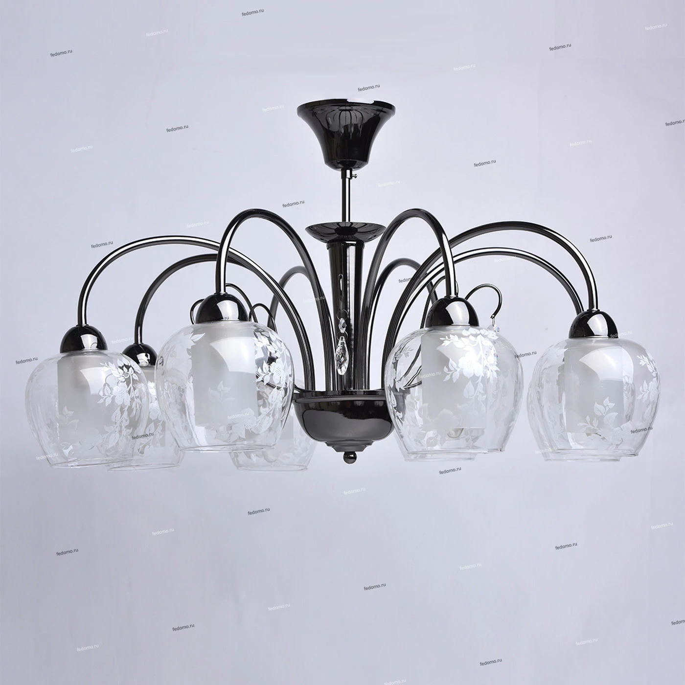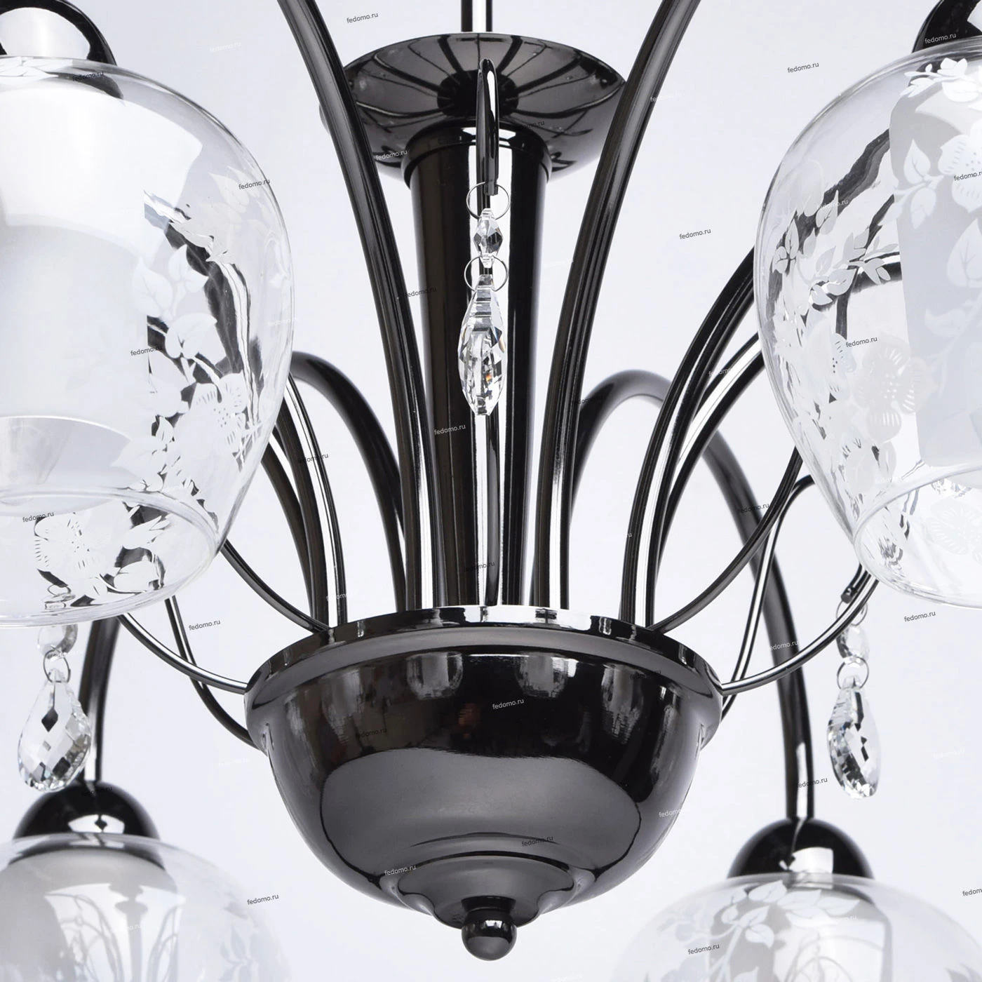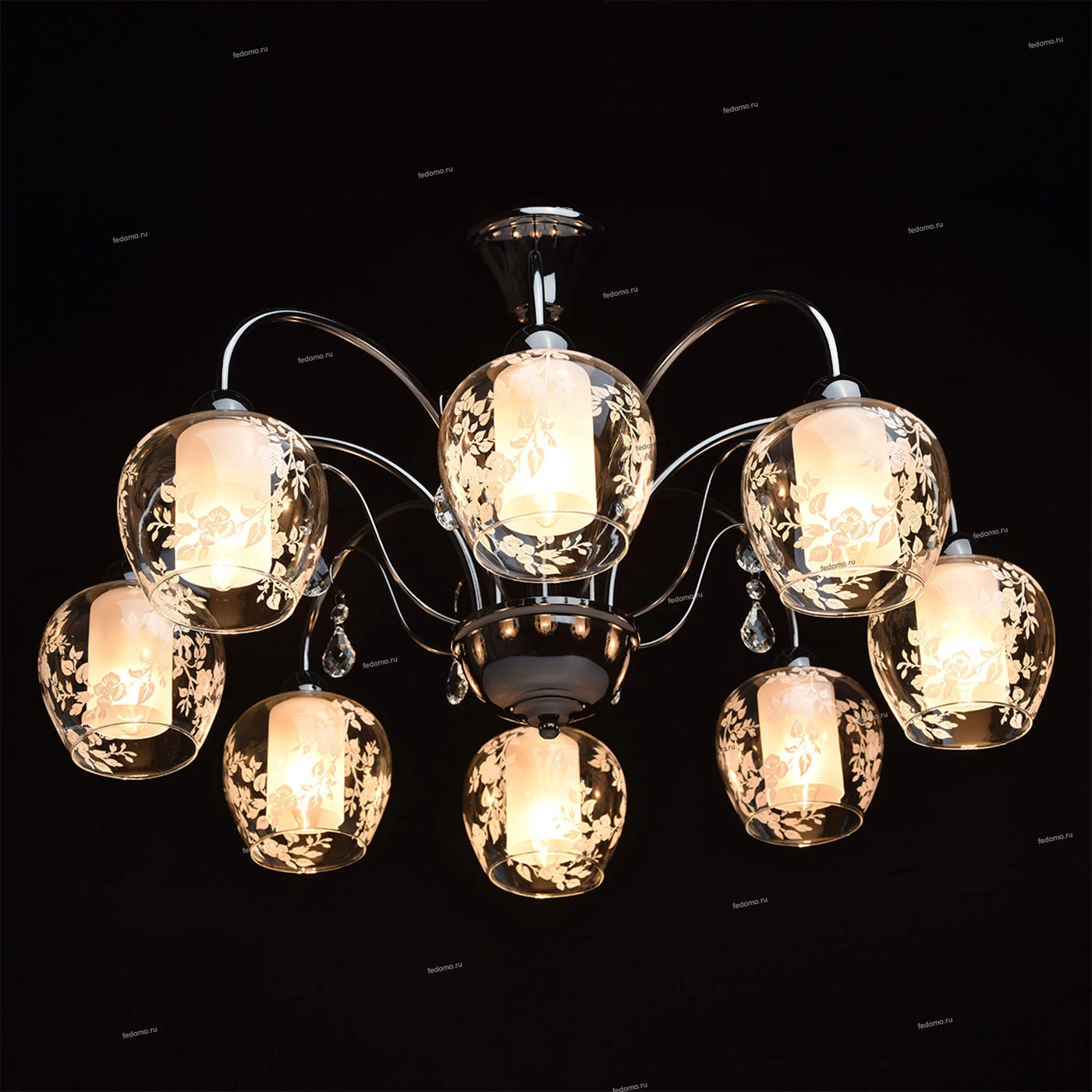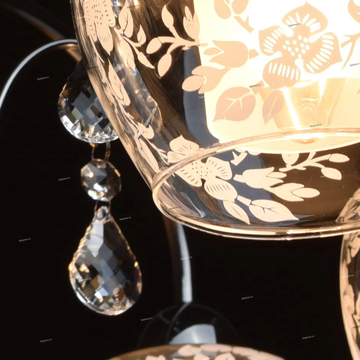 Металлическое основание цвета никель, двойные плафоны из прозрачного стекла с растительным трафаретным рисунком и внутренний матовый плафон, декоративные подвески из хрусталя