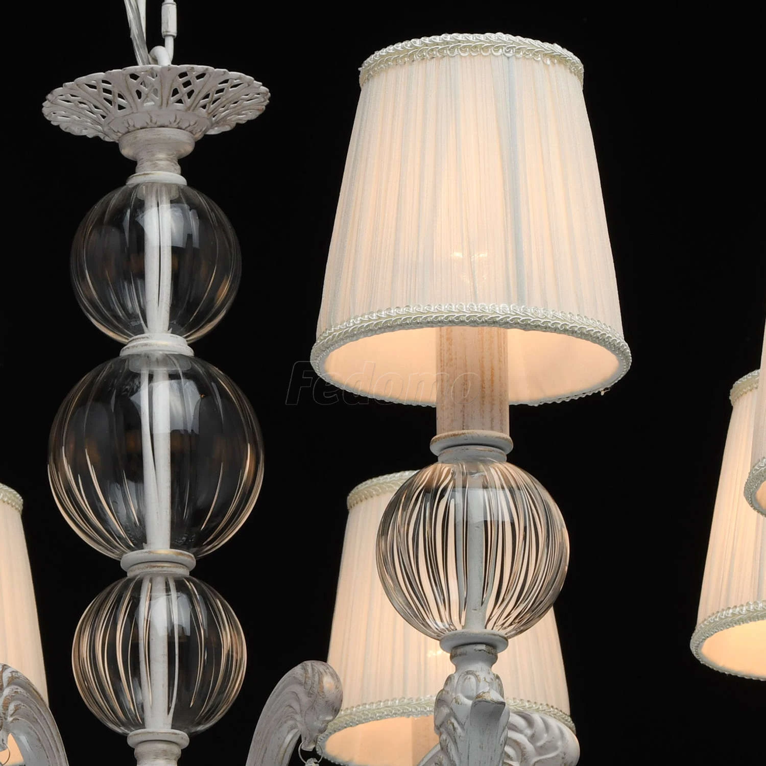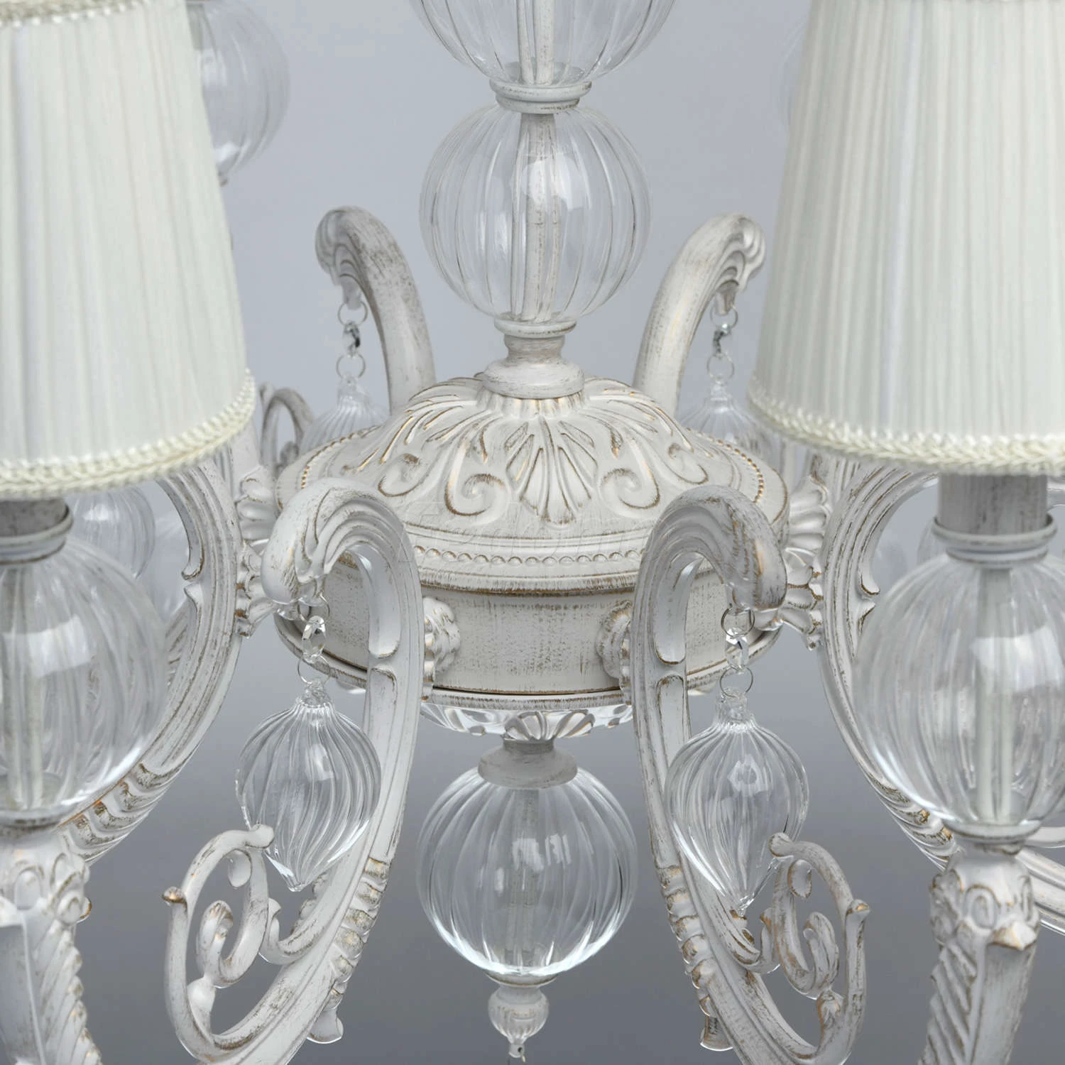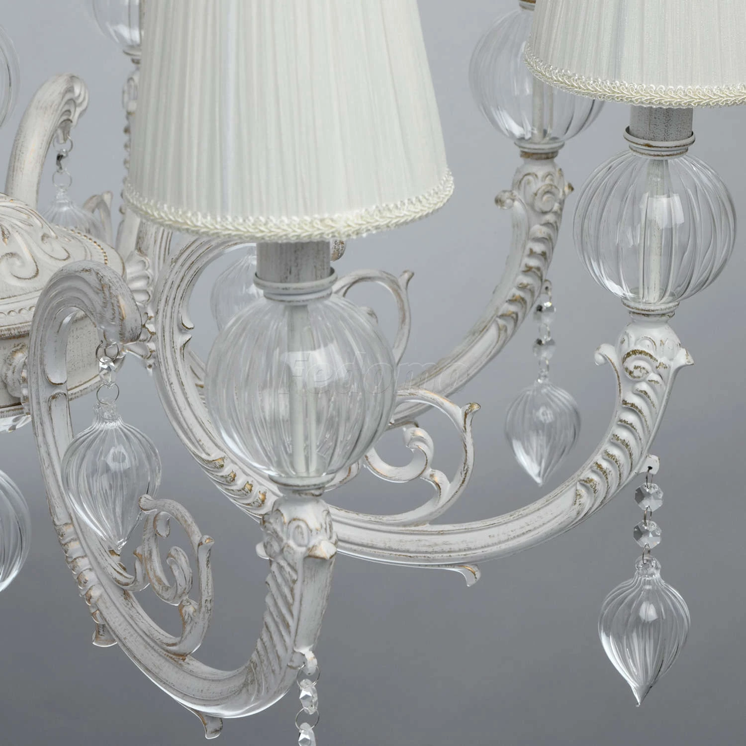 Роскошная люстра из коллекции «Валенсия» - решение для утонченных натур. Белое металлическое основание дополнено патинированием золотого оттенка. Изящный изгиб рожка и резные элементы подчеркнуты элегантными тканевыми абажурами в тон основанию. Эффектно с