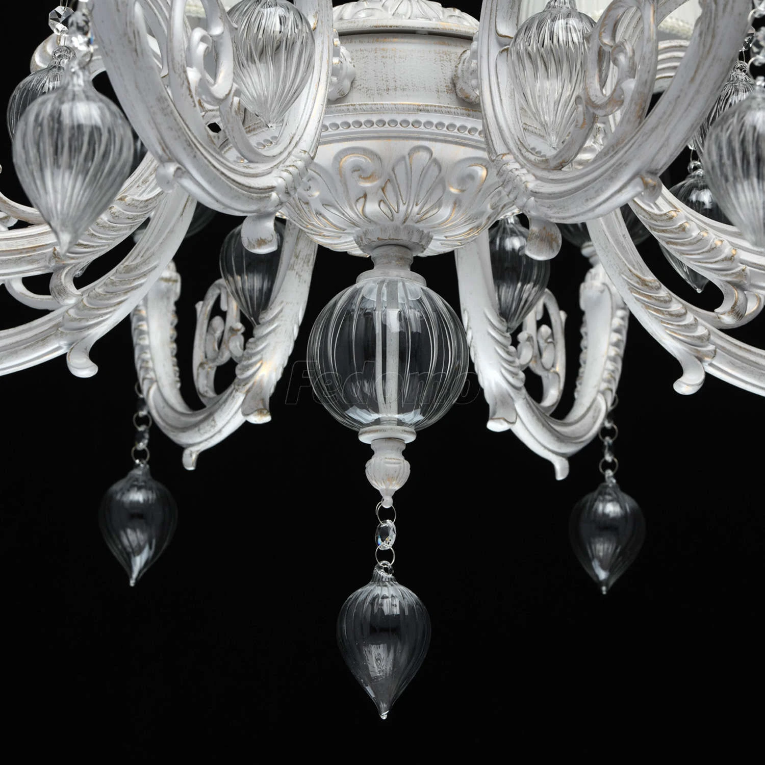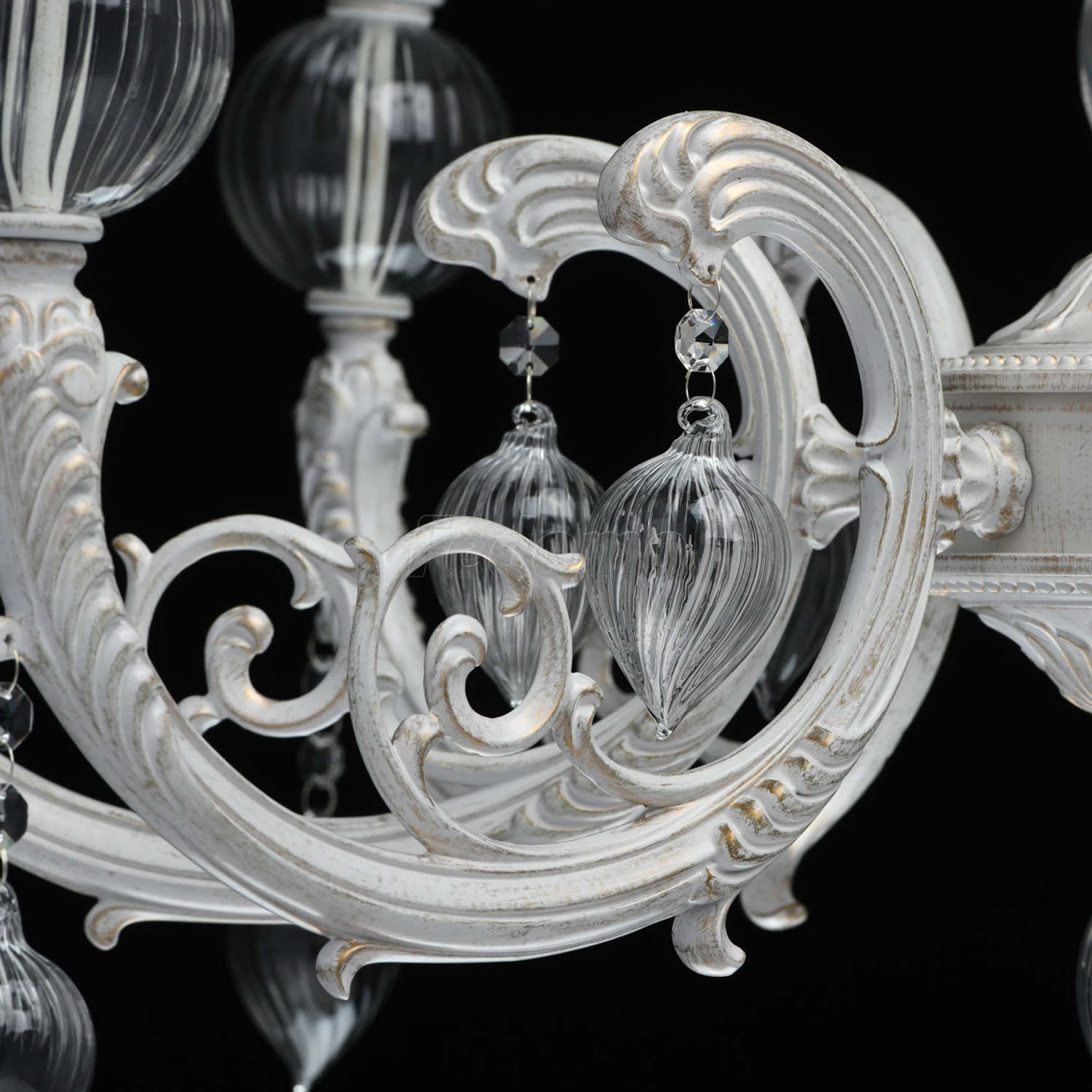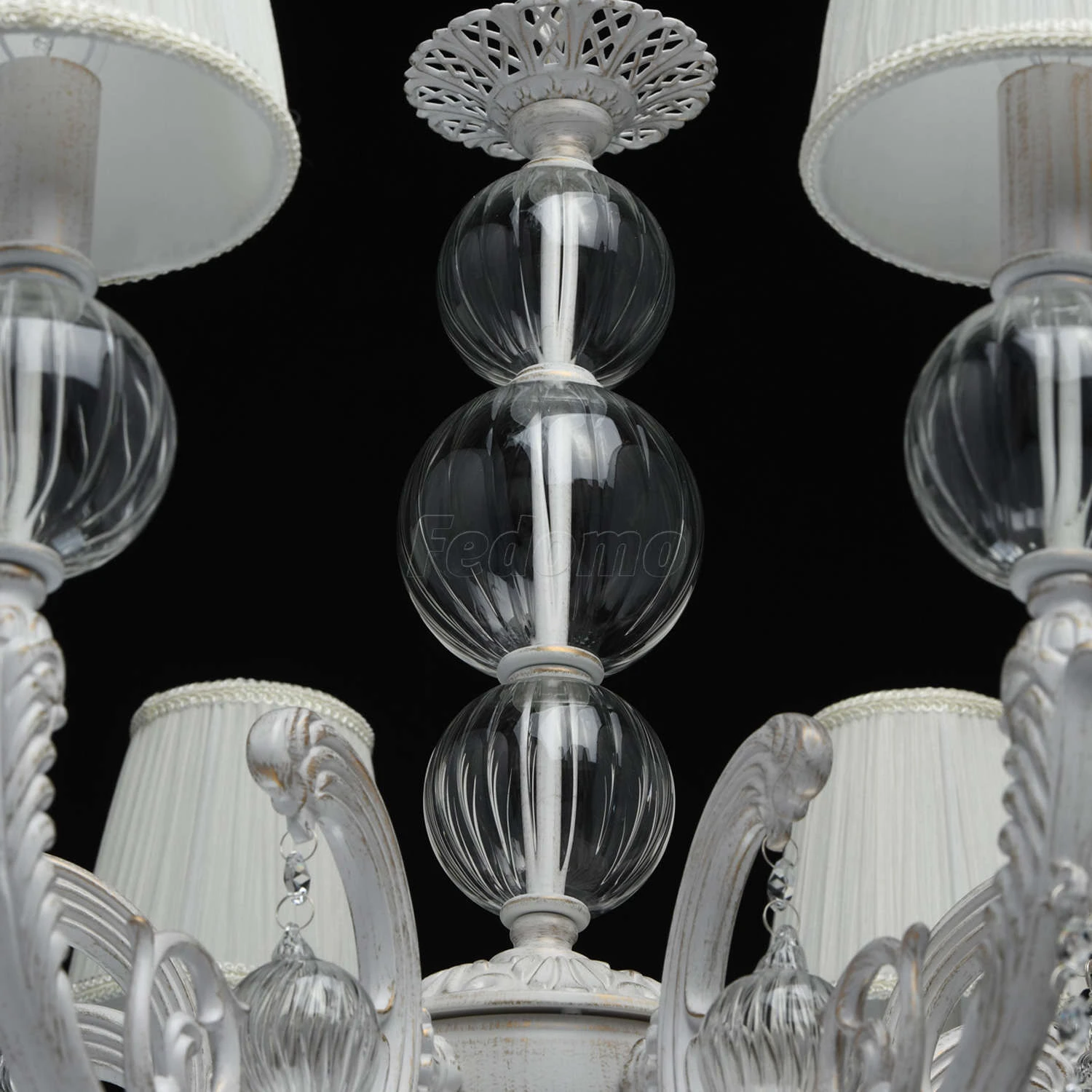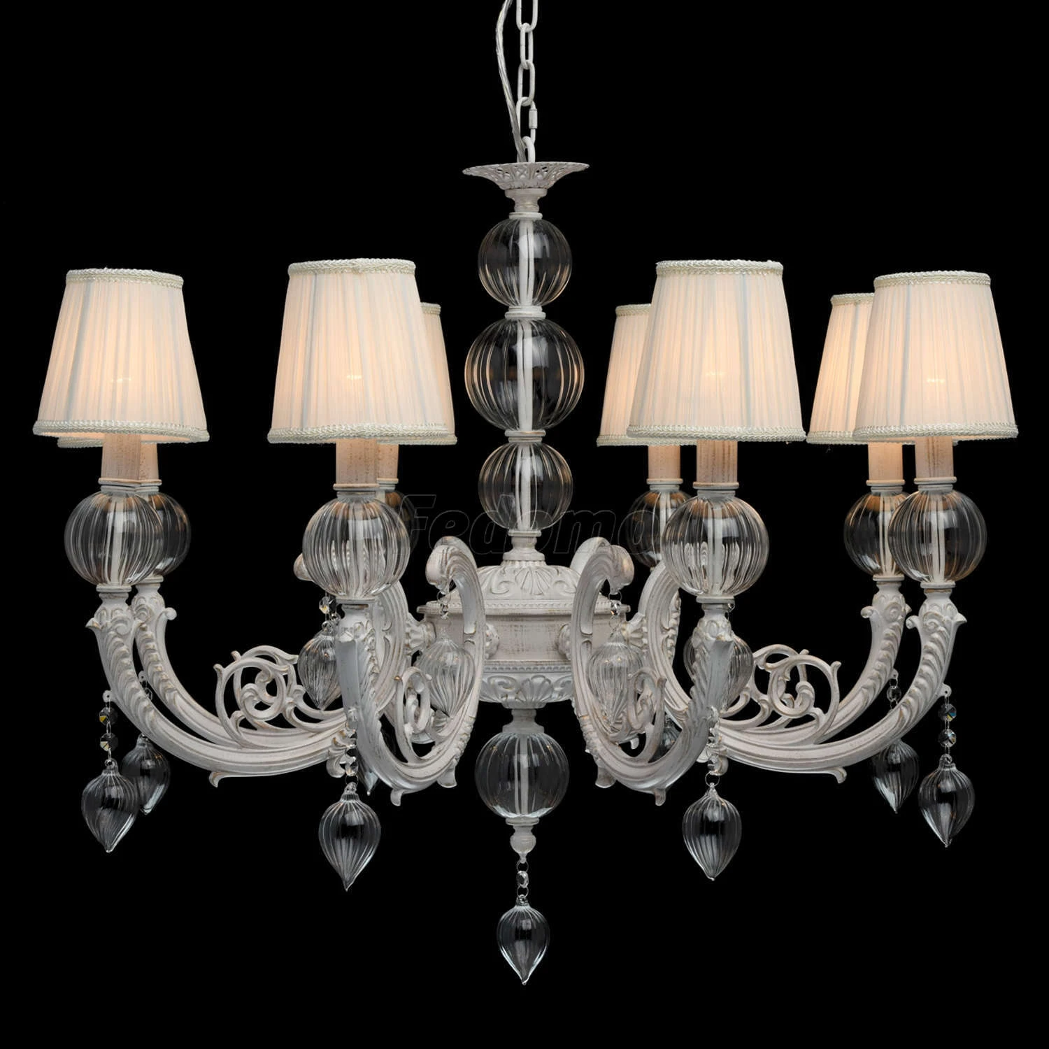Роскошная люстра из коллекции «Валенсия» - решение для утонченных натур. Белое металлическое основание дополнено патинированием золотого оттенка. Изящный изгиб рожка и резные элементы подчеркнуты элегантными тканевыми абажурами в тон основанию. Эффектно с