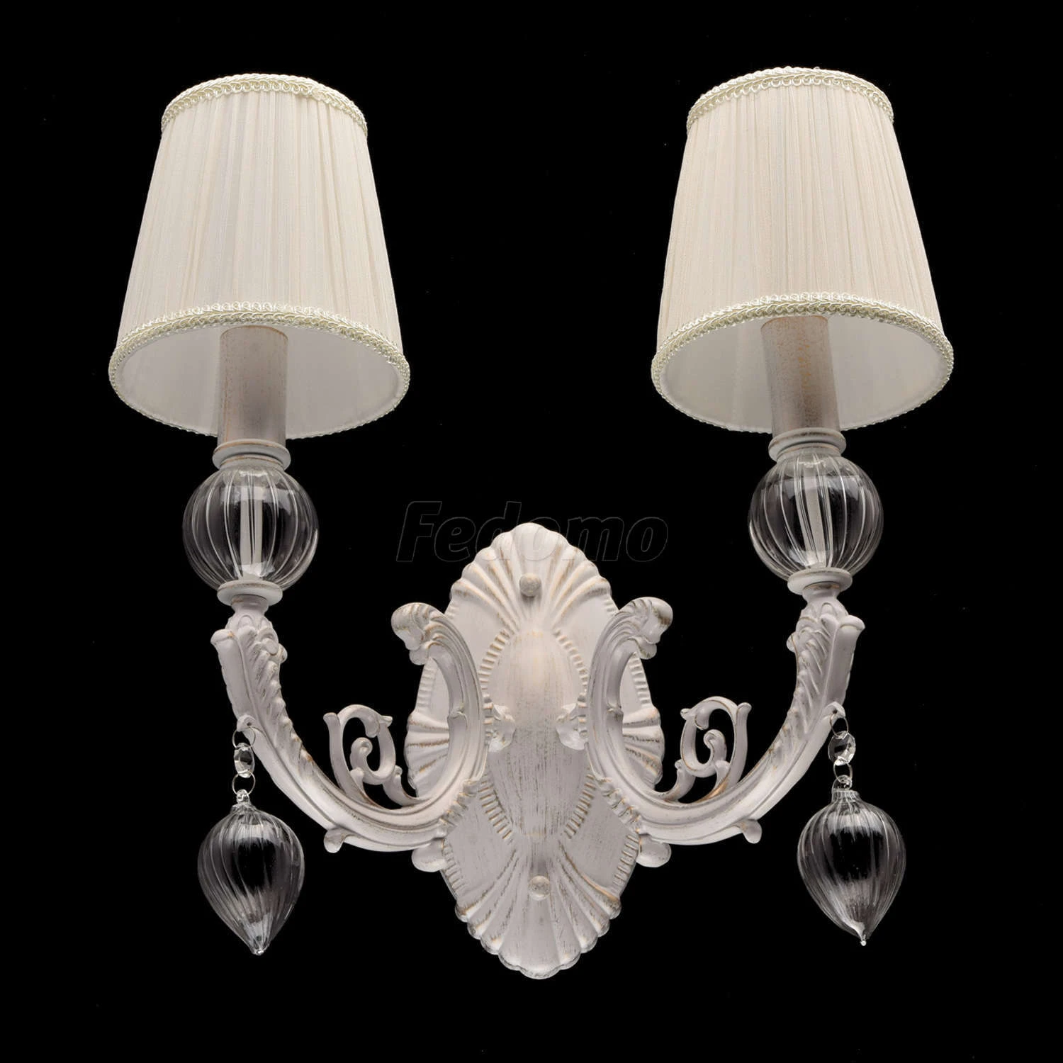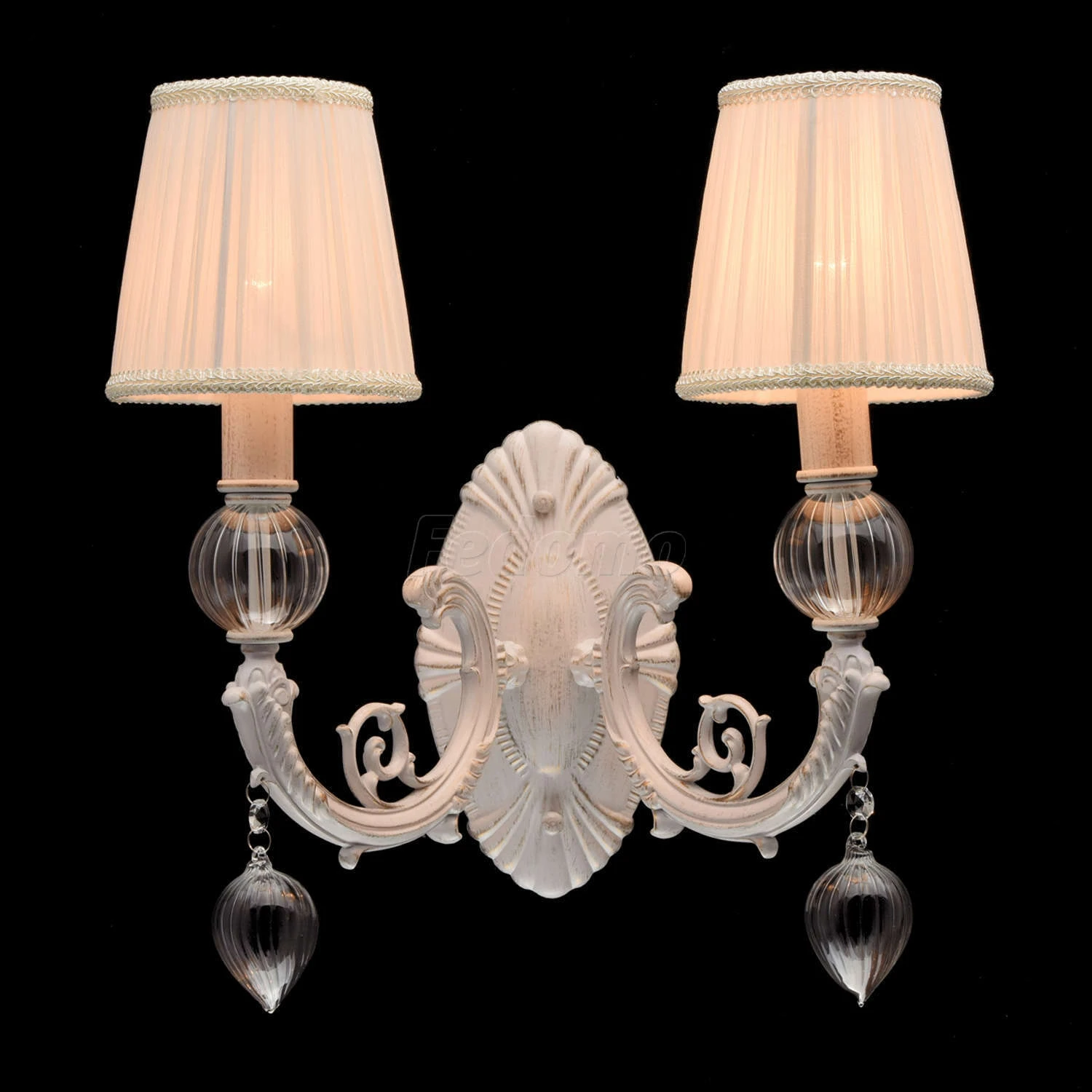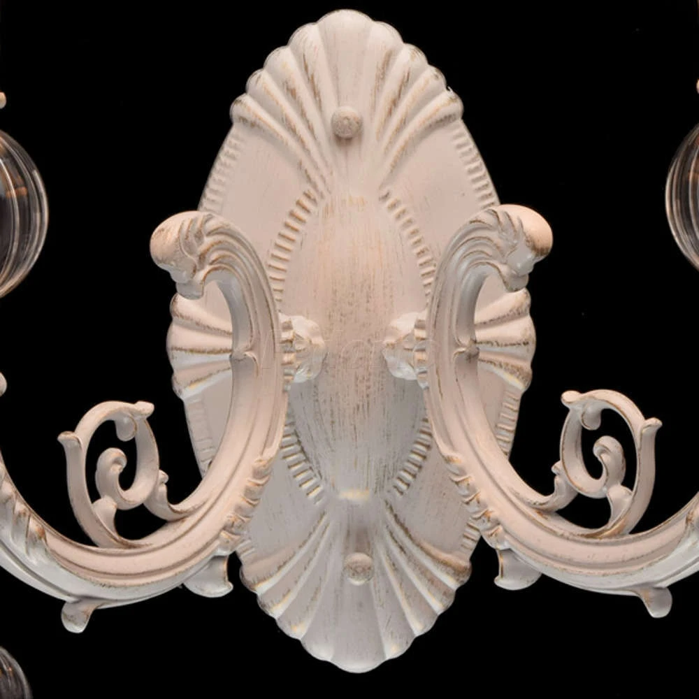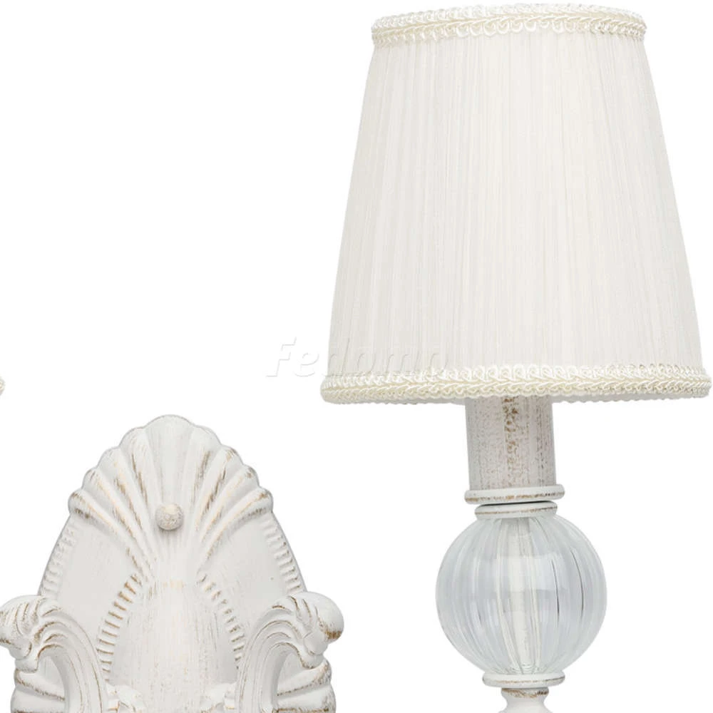 Роскошное бра из коллекции «Валенсия» - решение для утонченных натур. Белое металлическое основание дополнено патинированием золотого оттенка. Изящный изгиб рожка и резные элементы подчеркнуты элегантными тканевыми абажурами в тон основанию. Эффектно смот
