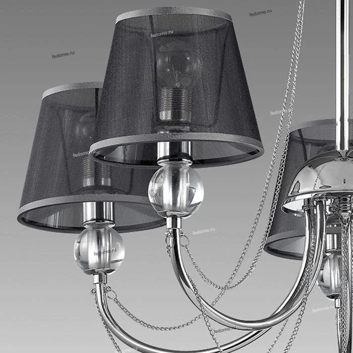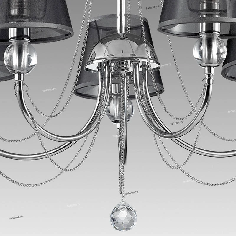Материалы исполнения арматура, декор: металлическая арматура украшена декоративными цепочкам, стеклянными элементами в виде шара и хрустальной подвеской; плафон: абажур из органзы. Цвет арматуры хром. Плафон в цвете: черный. Декор подвеска, материал декора хрусталь, цвет прозрачный. Люстра 3228/5 серии Asanta оформлена в современном стиле. Люстра состоит из абажуров из органзы актуального темного оттенка, и хромовой арматуры, украшенной декоративными цепочкам, стеклянными элементами в виде шара и хрустальной подвеской. Эта модель является ярким примером строгой современной элегантности. Цоколь Е14. Мощность 5x40W. Нет ламп в комплекте. Наименование 3228/5 LN16 095 хром/ткань/цепи/хрусталь Люстра Е14 5*40W 220V ASANTA.