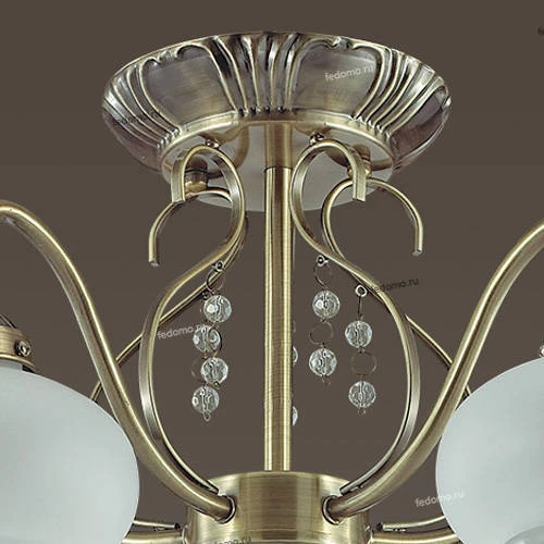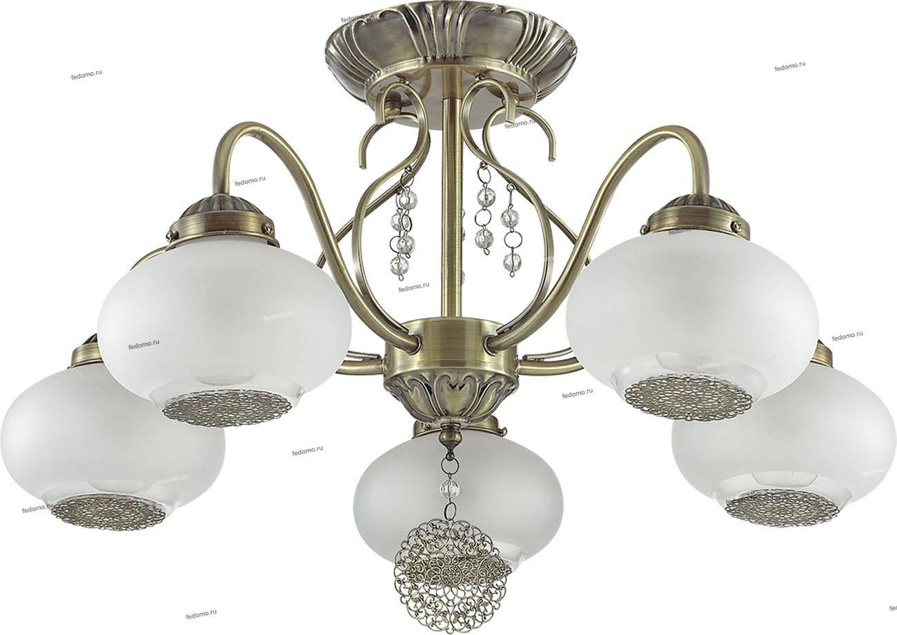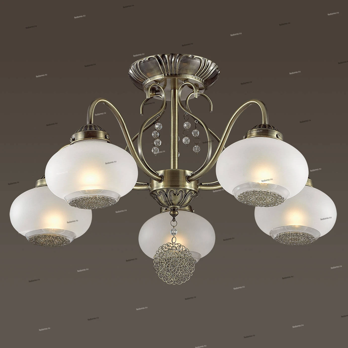 Материалы исполнения арматура, декор: металл, хрусталь; плафон: матовое стекло с с металлическим декором. Цвет арматуры бронзовый. Плафон в цвете: белый. Декор подвеска, материал декора хрусталь, цвет прозрачный. Elmina - функциональная, элегантная серия в бронзе. Крупный стеклянный сферический плафон из белого матового стекла, декорированный ажурной металлической плашкой дарит мягкий, рассеянный свет. Наименование 3287/5C LN17 158 бронзовый/стекло Люстра потолочная E14 5*40W 220V EMILINA.