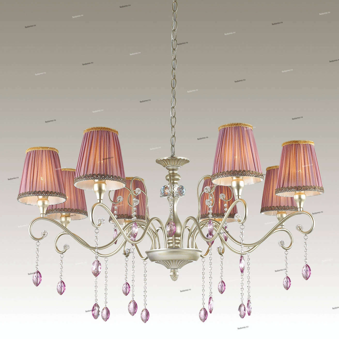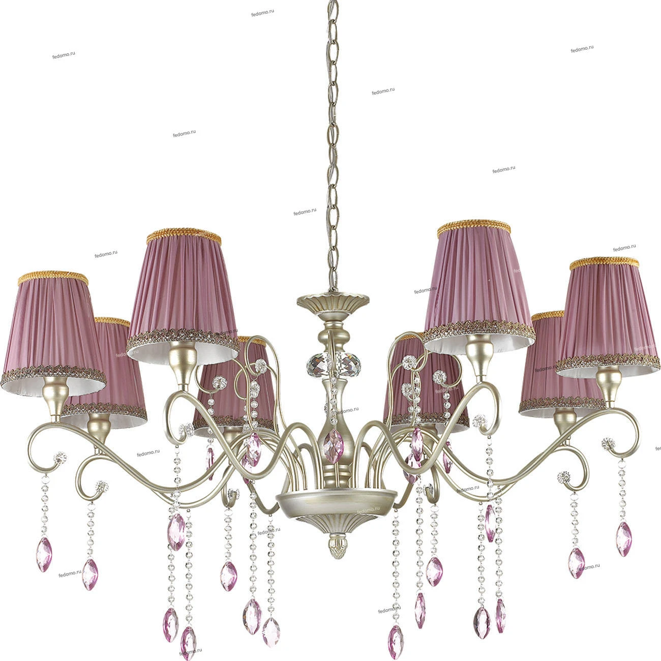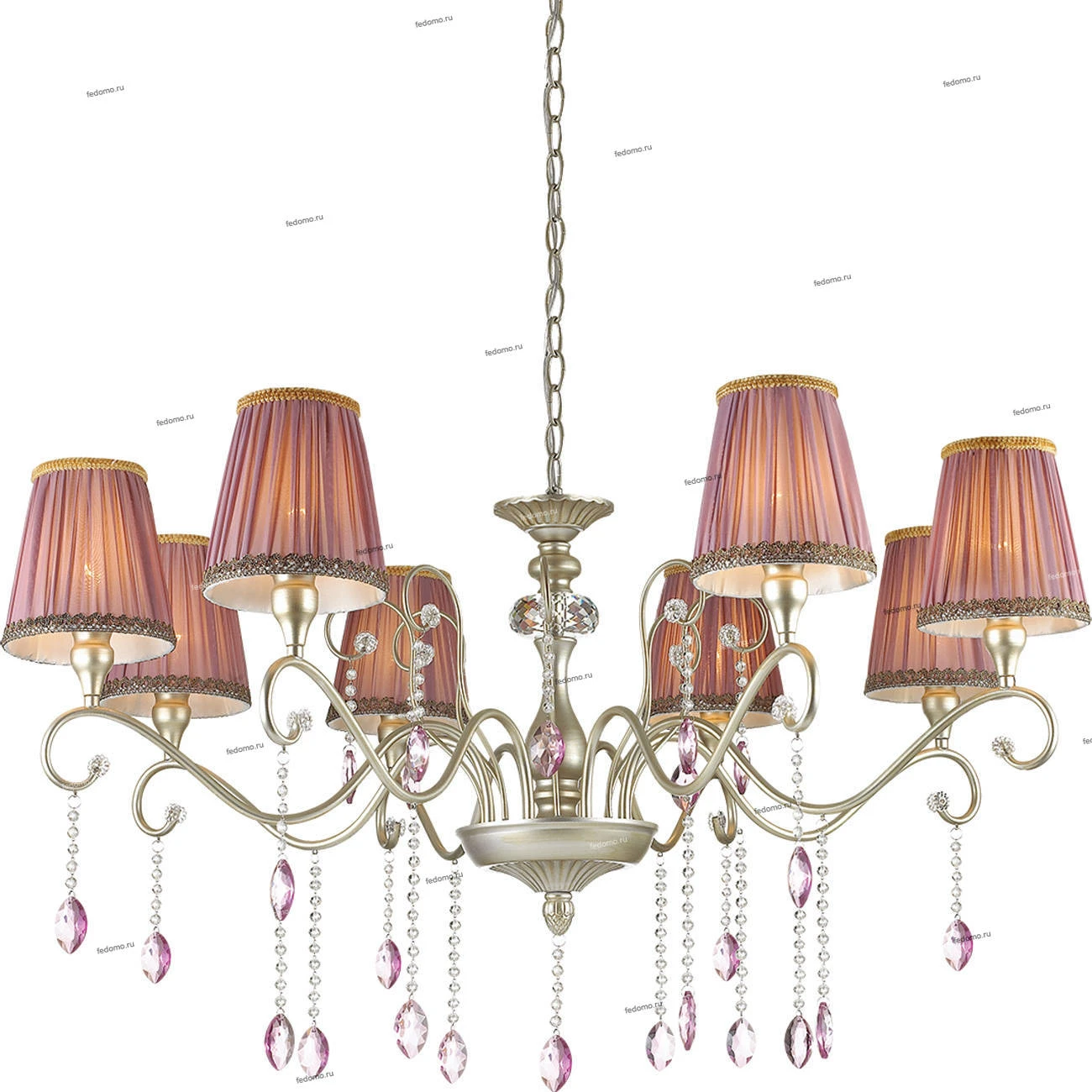 Материалы исполнения арматура, декор: металл, хрусталь, подвески; плафон: ткань органза. Цвет арматуры серебро. Плафон в цвете: фиолетовый. Декор подвеска, материал декора хрусталь, цвет фиолетовый. Люстра 3393/8 серии Gaellori выполнена в изысканном цвете "матовое серебро". Люстра украшена декоративным элементом в виде массивного хрусталя с точеными гранями, изящно изогнутыми рожками, необычными хрустальными подвесками цвета "аметист" и абажурами из тонкой плиссированной ткани нежного лилового оттенка, волшебный свет от которых будет действовать умиротворяюще, успокаивающе, окутает своей нежностью и необыкновенной загадочностью. Цоколь E14. Мощность 6*40W. Нет ламп в комплекте. Наименование 3393/8 ODL17 386 мат.золото/серебр.патина/абажур ткань/хрусталь Люстра E14 8*40W 220V GAELLORI.