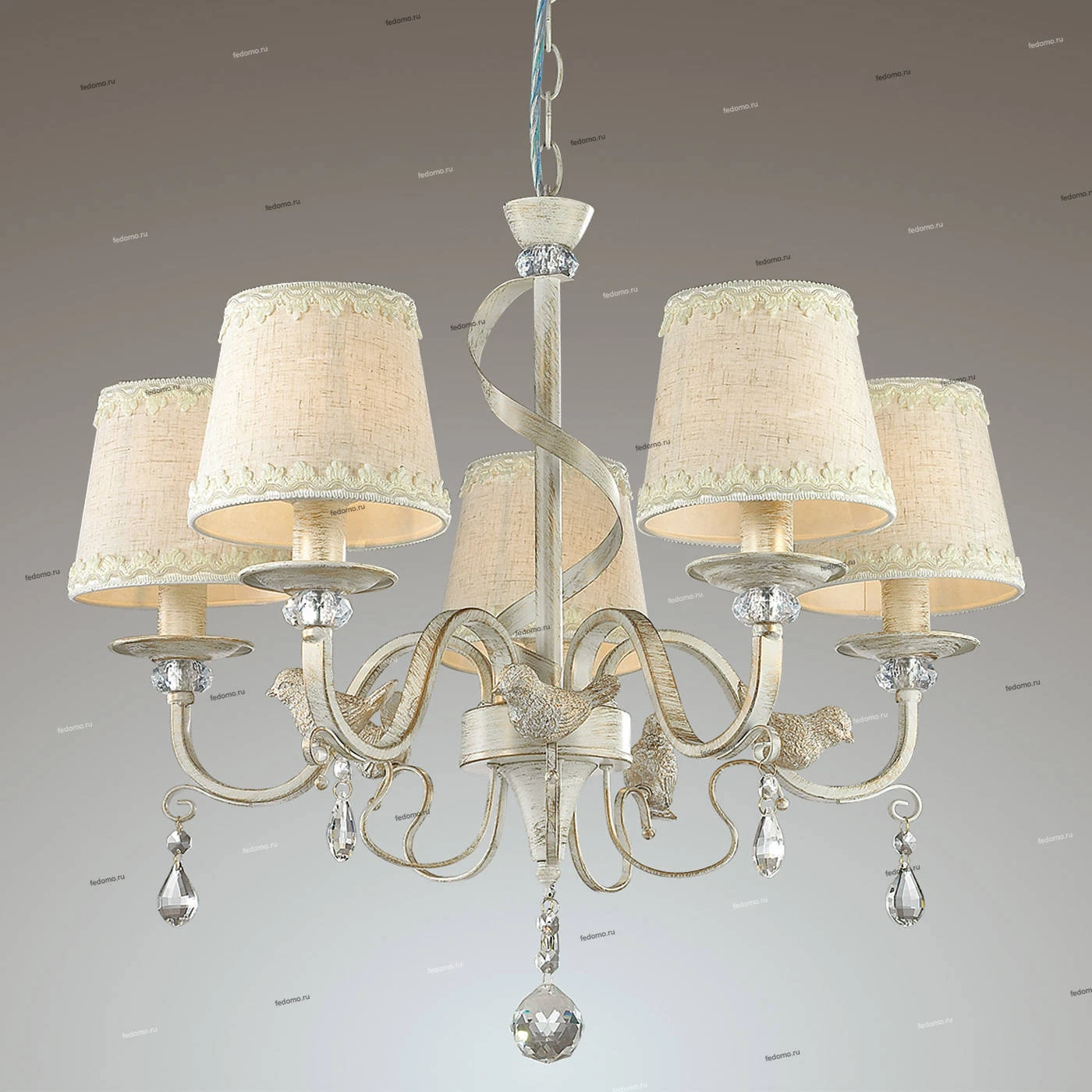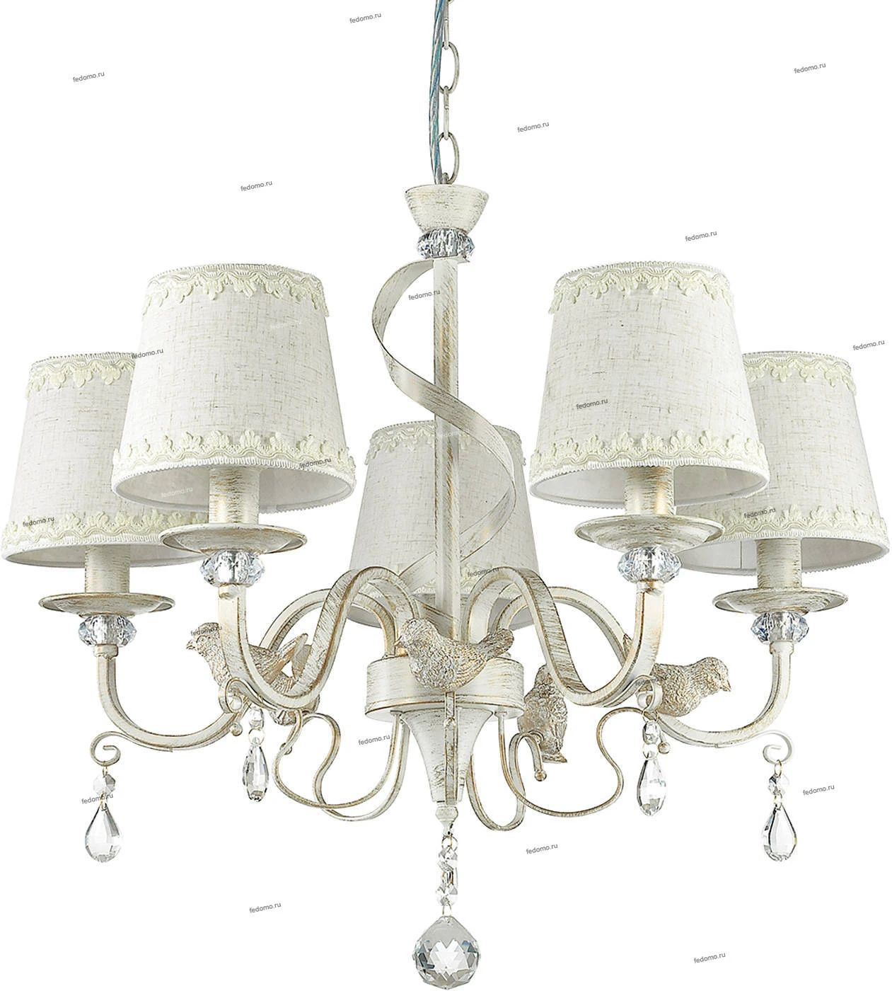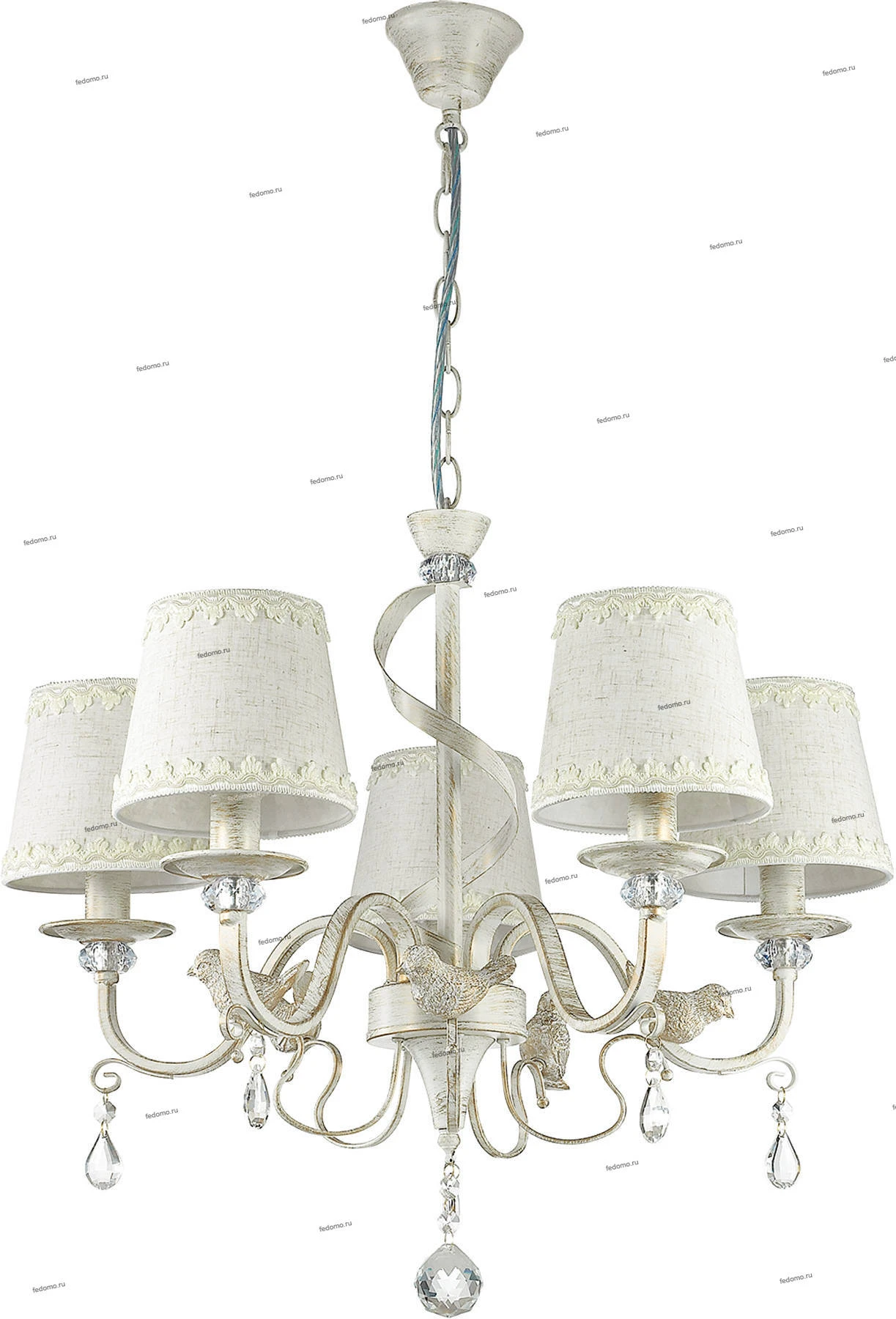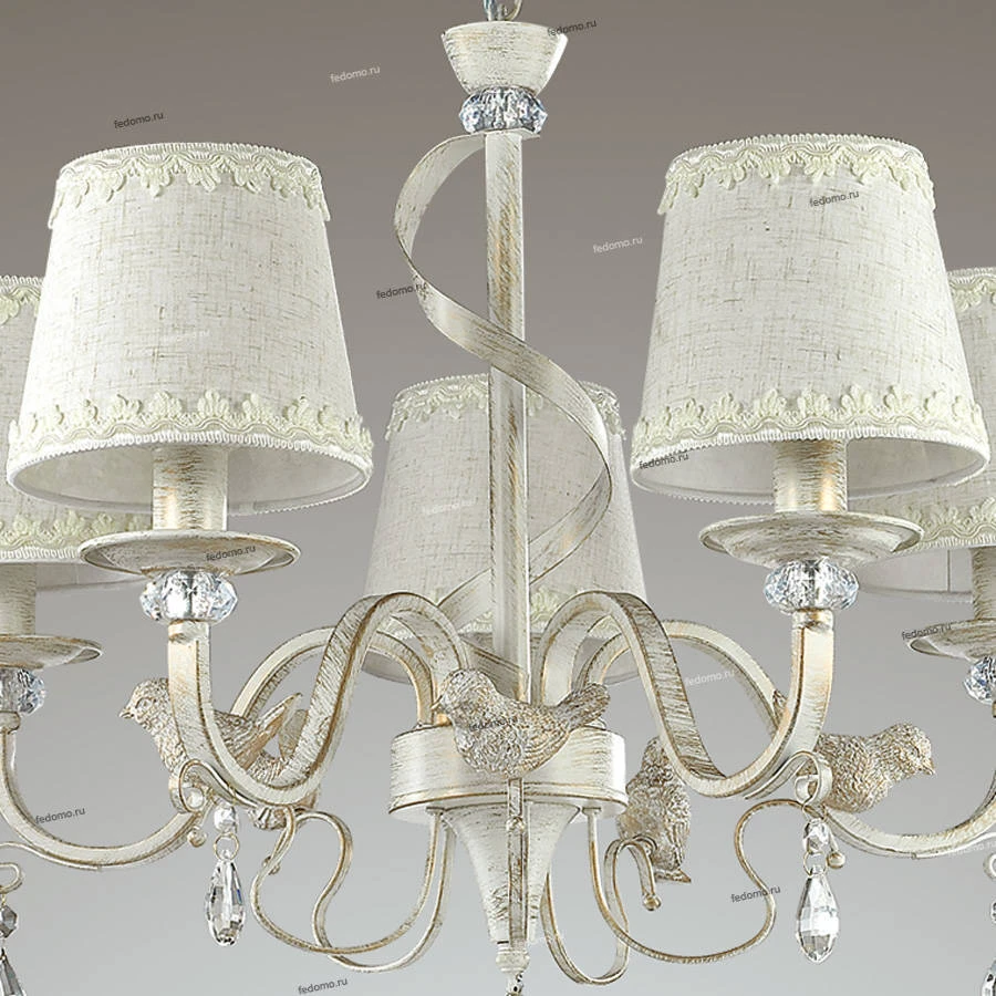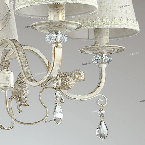 Люстра подвесная хрустальная 3404/5 из серии Freri от компании Lumion регулируется по высоте и устанавливается на монтажную пластину. Классическая люстра с птичками украшена декоративными элементами, подвесками из хрусталя и металла и прекрасно подойдет в качестве источника основного света для гостиной, прихожей и коридора, кафе, кабинета, оформленных в стиле прованс. Основной цвет модели - белый, материал арматуры - металл. Люстра имеет 5 абажуров со свечением вверх, материал изготовления - матовая ткань. Модель оснащена цоколем E14 (5xE14), имеет 5 лампочек с общей мощностью 200W и напряжением 220V. Светильник поддерживает подключение диммера. Габариты: длина - 580 мм, ширина - 580 мм, диаметр - 560 мм. Лампочки в комплект не входят. Лучшая цена и условия доставки на Lumion 3404/5 в интернет-магазине Fedomo.ru.