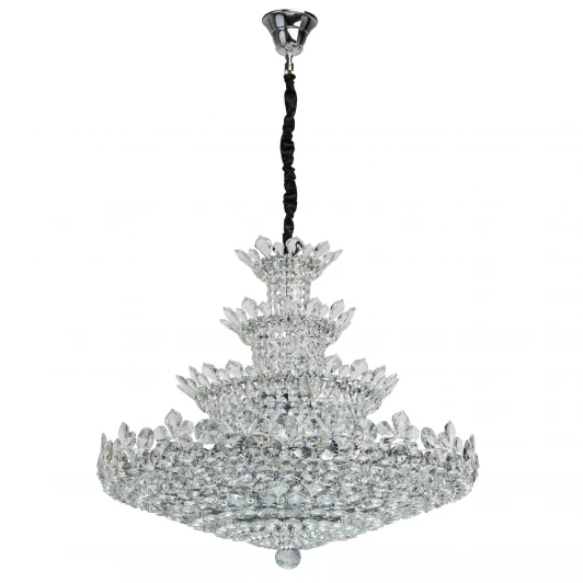 Роскошная люстра из коллекции «Лаура» напоминает великолепный драгоценный цветок. Металлическое основание светильника создает гармоничный дуэт с многоуровневой хрустальной композицией, выполненной в двух вариациях: прозрачной и оттенка шампань. Крупный хр