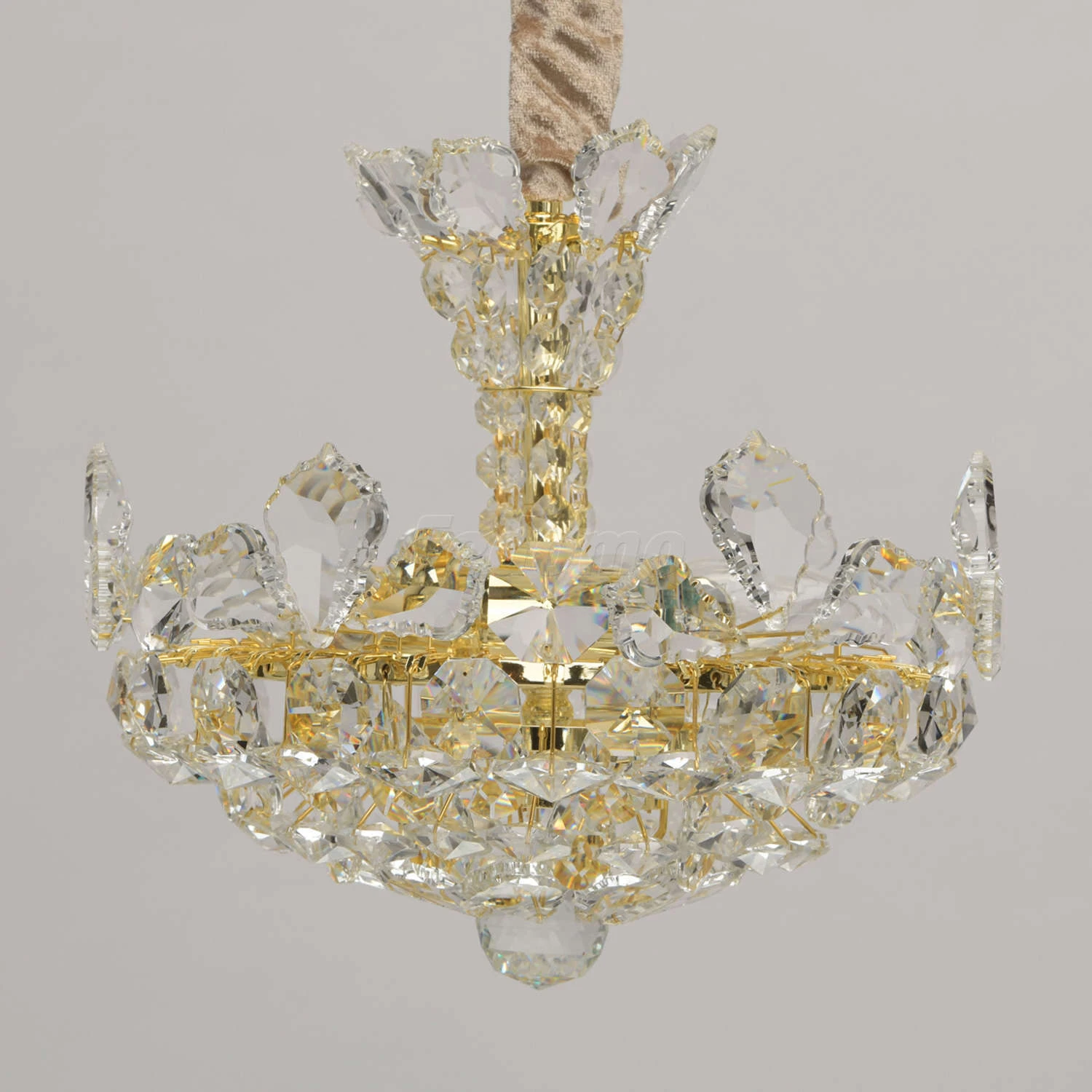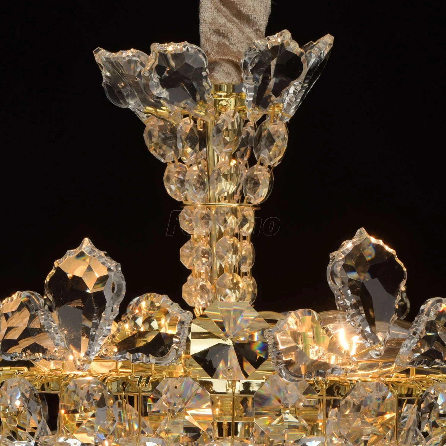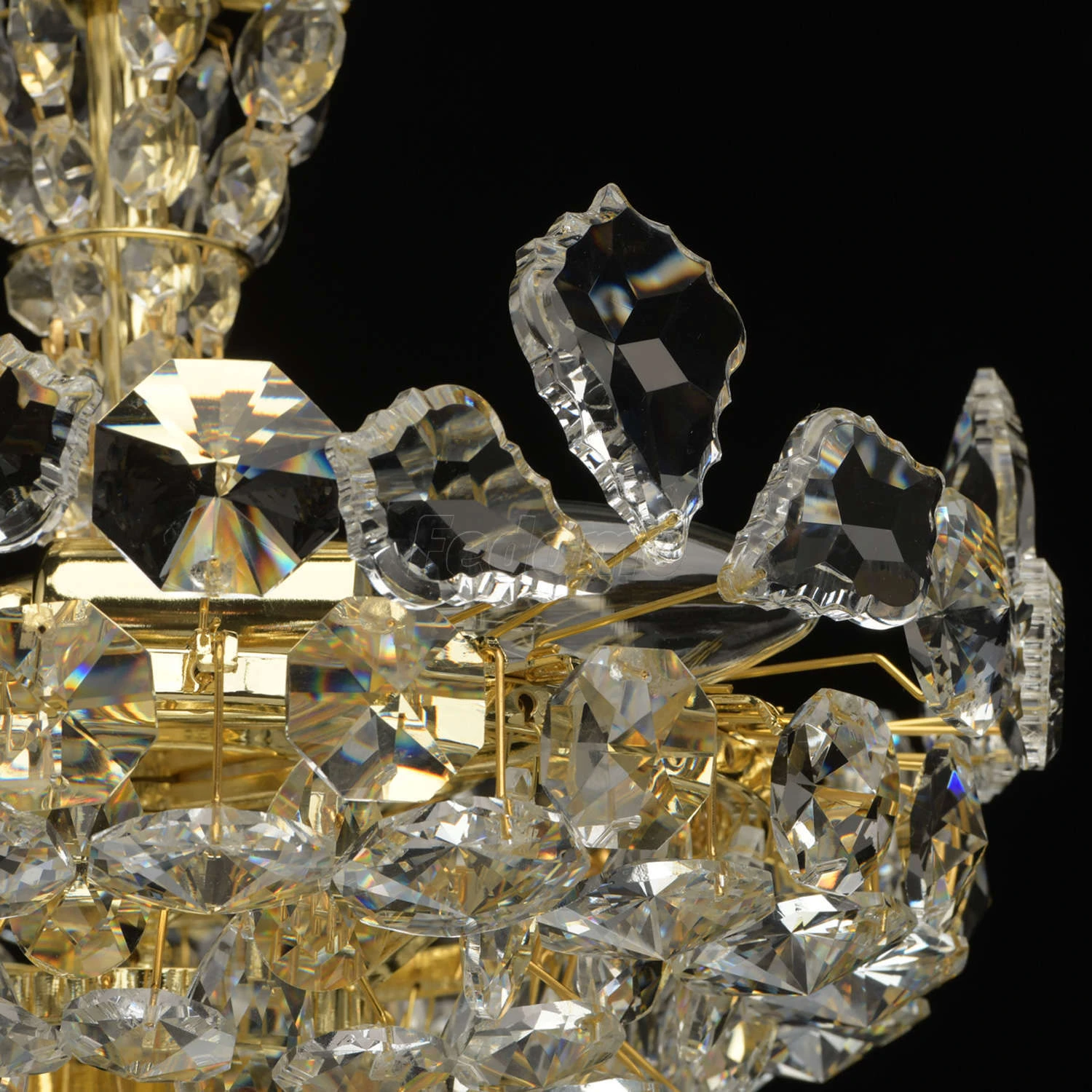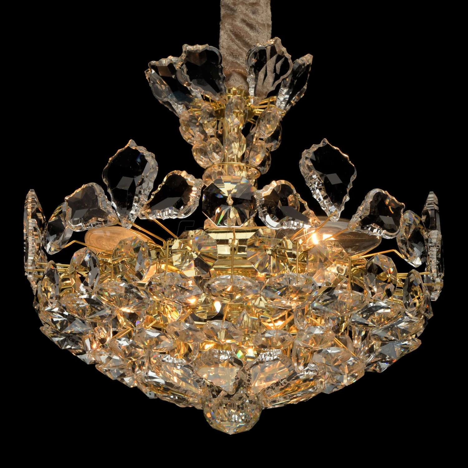 Роскошная люстра из коллекции «Лаура» напоминает великолепный драгоценный цветок. Металлическое основание светильника создает гармоничный дуэт с многоуровневой хрустальной композицией, выполненной в двух вариациях: прозрачной и оттенка шампань. Крупный хр