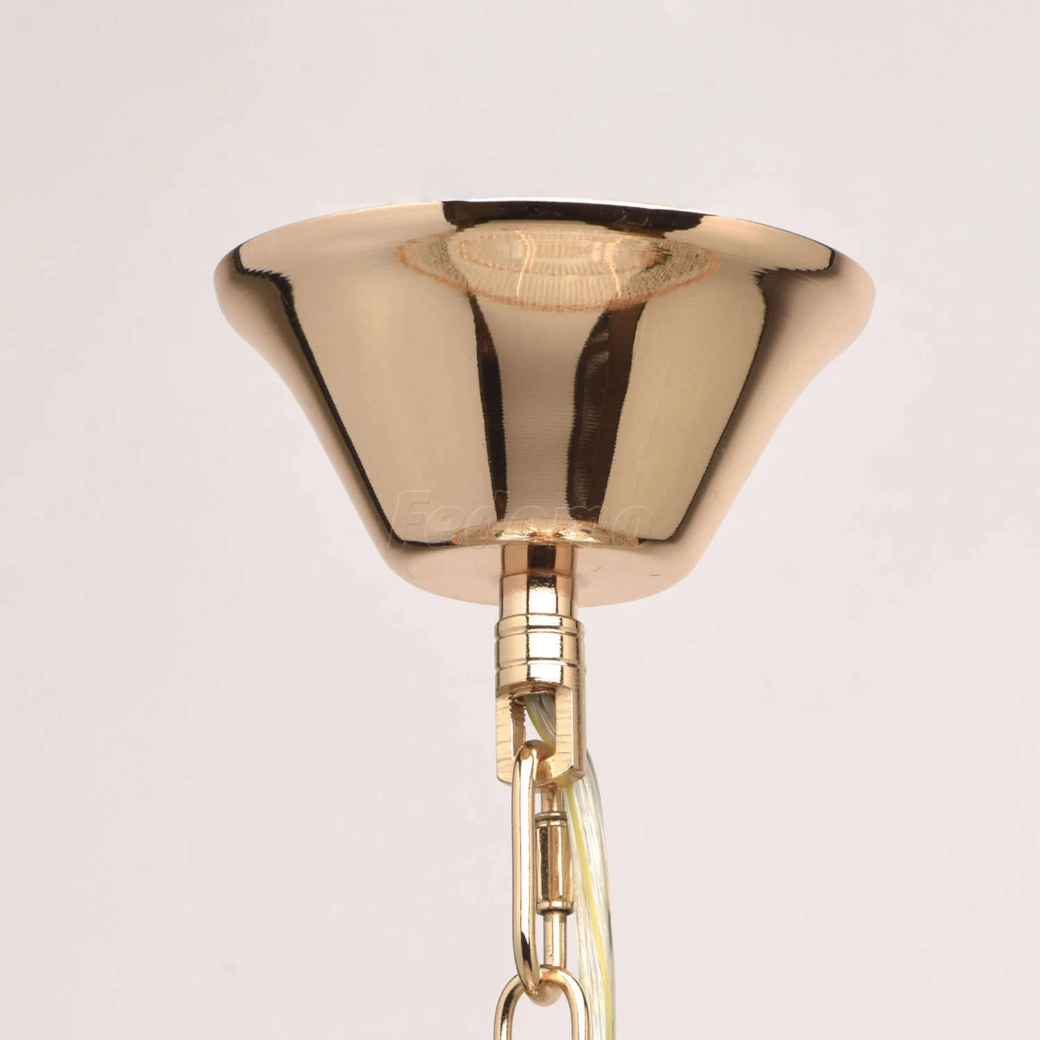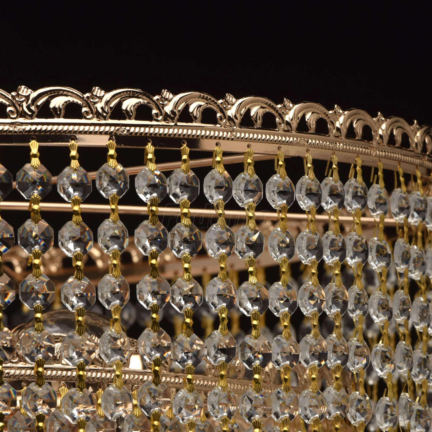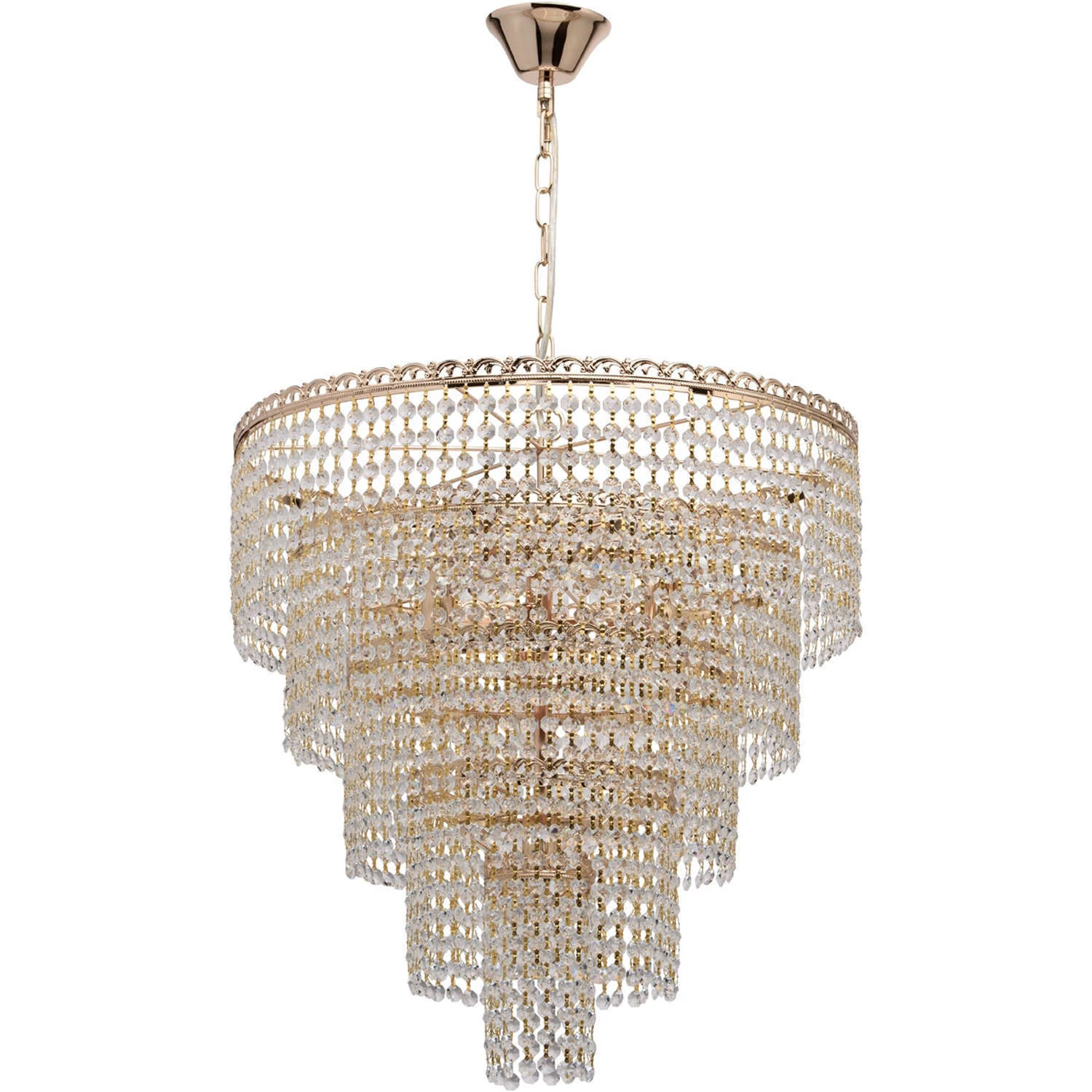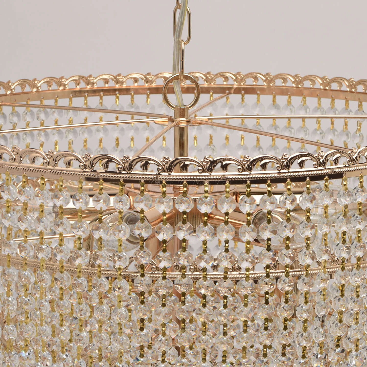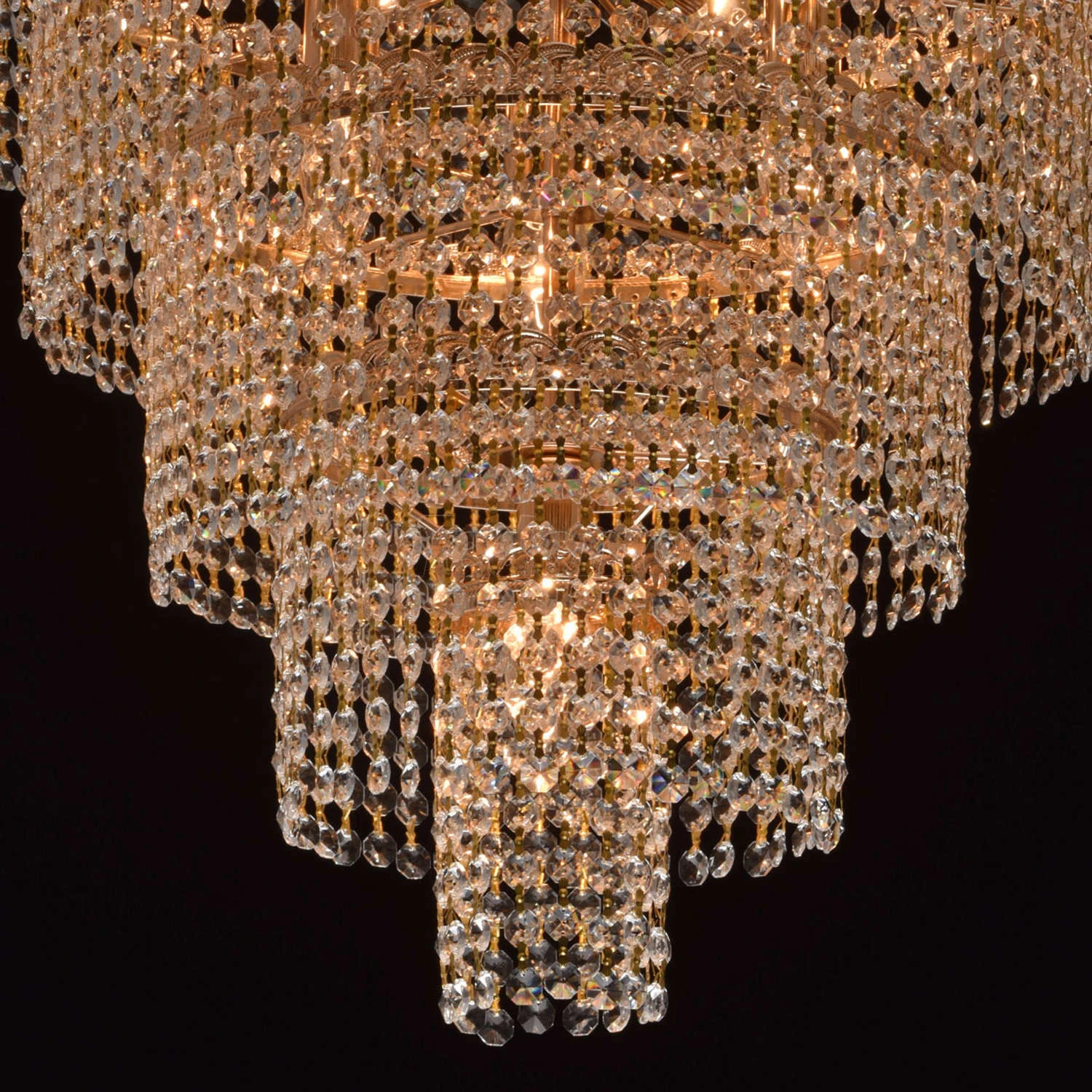 Объемная хрустальная люстра из коллекции «Изабелла» наполнит комнату многогранной игрой света и праздничными переливами. Основание из металла цвета французского золота окутывают многоуровневые подвески из прозрачного хрусталя. Они прикреплены с помощью ме