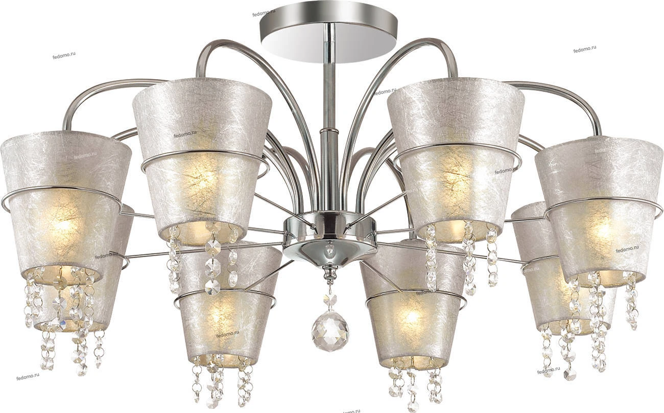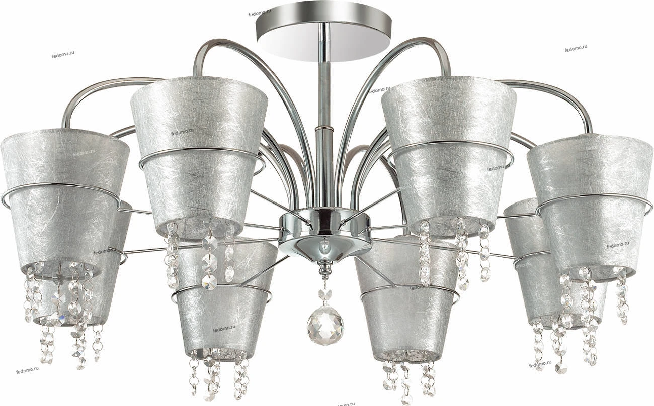 Материалы исполнения арматура, декор: металл, хрусталь; абажур: ткань. Цвет арматуры хром. Плафон в цвете: серебро. Декор подвеска, материал декора хрусталь, цвет прозрачный. Серию Buonaprana отличают необычные перевернутые абажуры из ткани серебристого цвета и свисающими из них хрустальными подвесками. Металлическое основание покрашено в цвет хром. Такое сочетание смотрится необычно, свежо и очень оригинально. Наименование 3520/8C LN18 138 хром Люстра потолочная E14 8*40W 220V BUONAPRANA.